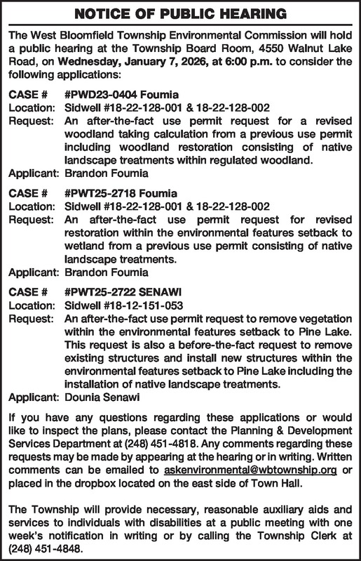 NOTICE OF PUBLIC HEARING The West Bloomfield Township Environmental Commission will hold a public hearing at the Township Board Room, 4550 Walnut Lake Road, on Wednesday, January 7, 2026, at 6:00 p.m. to consider the following applications: CASE # #PWD23-0404 Foumia Location: Sidwell #18-22-128-001 & 18-22-128-002 Request: An after-the-fact use permit request for a revised woodland taking calculation from a previous use permit including woodland restoration consisting of native landscape treatments within regulated woodland. Applicant: Brandon Foumia CASE # #PWT25-2718 Foumia Location: Sidwell #18-22-128-001 & 18-22-128-002 Request: An after-the-fact use permit request for revised restoration within the environmental features setback to wetland from a previous use permit consisting of native landscape treatments. Applicant: Brandon Foumia CASE # #PWT25-2722 SENAWI Location: Sidwell #18-12-151-053 Request: An after-the-fact use permit request to remove vegetation within the environmental features setback to Pine Lake. This request is also a before-the-fact request to remove existing structures and install new structures within the environmental features setback to Pine Lake including the installation of native landscape treatments. Applicant: Dounia Senawi If you have any questions regarding these applications or would like to inspect the plans, please contact the Planning & Development Services Department at (248) 451-4818. Any comments regarding these requests may be made by appearing at the hearing or in writing. Written comments can be emailed to askenvironmental@wbtownship.org or placed in the dropbox located on the east side of Town Hall. The Township will provide necessary, reasonable auxiliary aids and services to individuals with disabilities at a public meeting with one week’s notification in writing or by calling the Township Clerk at (248) 451-4848