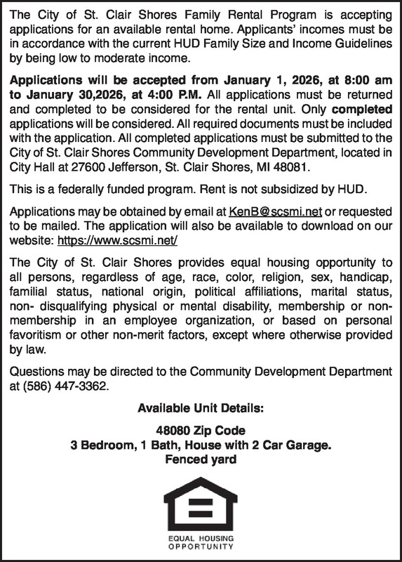 The City of St. Clair Shores Family Rental Program is accepting applications for an available rental home. Applicants’ incomes must be in accordance with the current HUD Family Size and Income Guidelines by being low to moderate income. Applications will be accepted from January 1, 2026, at 8:00 am to January 30,2026, at 4:00 P.M. All applications must be returned and completed to be considered for the rental unit. Only completed applications will be considered. All required documents must be included with the application. All completed applications must be submitted to the City of St. Clair Shores Community Development Department, located in City Hall at 27600 Jefferson, St. Clair Shores, MI 48081. This is a federally funded program. Rent is not subsidized by HUD. Applications may be obtained by email at KenB@scsmi.net or requested to be mailed. The application will also be available to download on our website: https://www.scsmi.net/ The City of St. Clair Shores provides equal housing opportunity to all persons, regardless of age, race, color, religion, sex, handicap, familial status, national origin, political affiliations, marital status, non- disqualifying physical or mental disability, membership or non-membership in an employee organization, or based on personal favoritism or other non-merit factors, except where otherwise provided by law. Questions may be directed to the Community Development Department at (586) 447-3362. Available Unit Details: 48080 Zip Code 3 Bedroom, 1 Bath, House with 2 Car Garage. Fenced yard
