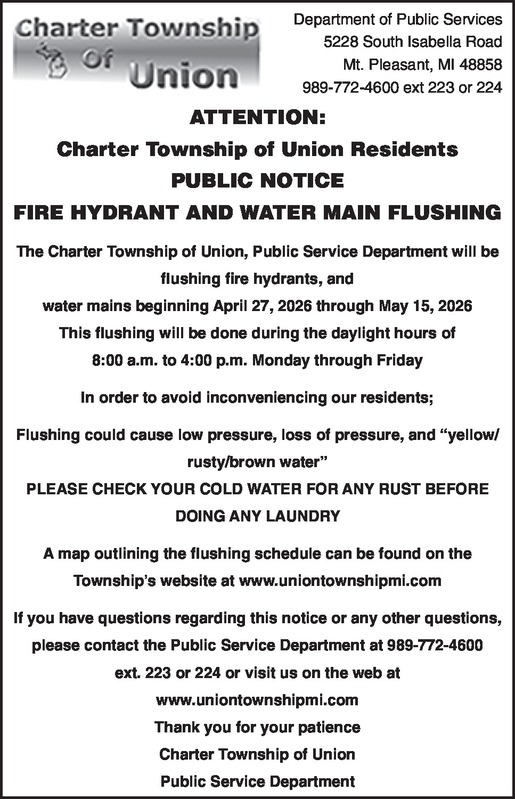ATTENTION: Charter Township of Union Residents PUBLIC NOTICE FIRE HYDRANT AND WATER MAIN FLUSHING The Charter Township of Union, Public Service Department will be flushing fire hydrants, and water mains beginning April 27, 2026 through May 15, 2026 This flushing will be done during the daylight hours of 8:00 a.m. to 4:00 p.m. Monday through Friday In order to avoid inconveniencing our residents; We will not be flushing on the weekends. Flushing could cause low pressure, loss of pressure, and “yellow/rusty/brown water” PLEASE CHECK YOUR COLD WATER FOR ANY RUST BEFORE DOING ANY LAUNDRY A map outlining the flushing schedule can be found on the Township’s website at www.uniontownshipmi.com If you have questions regarding this notice or any other questions, please contact the Public Service Department at 989-772-4600 ext. 223 or 224 or visit us on the web at www.uniontownshipmi.com Thank you for your patience Charter Township of Union Public Service Department