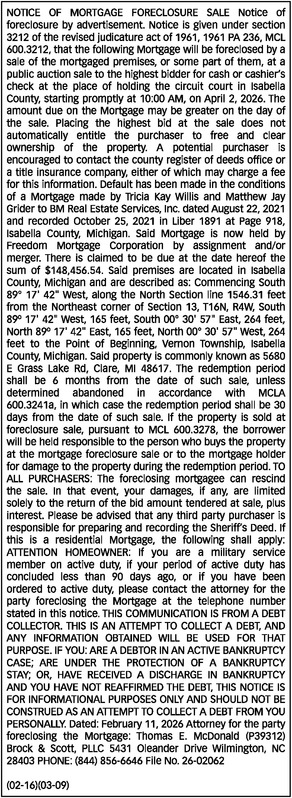 NOTICE OF MORTGAGE FORECLOSURE SALE Notice of foreclosure by advertisement. Notice is given under section 3212 of the revised judicature act of 1961, 1961 PA 236, MCL 600.3212, that the following Mortgage will be foreclosed by a sale of the mortgaged premises, or some part of them, at a public auction sale to the highest bidder for cash or cashier’s check at the place of holding the circuit court in Isabella County, starting promptly at 10:00 AM, on April 2, 2026. The amount due on the Mortgage may be greater on the day of the sale. Placing the highest bid at the sale does not automatically entitle the purchaser to free and clear ownership of the property. A potential purchaser is encouraged to contact the county register of deeds office or a title insurance company, either of which may charge a fee for this information. Default has been made in the conditions of a Mortgage made by Tricia Kay Willis and Matthew Jay Grider to BM Real Estate Services, Inc. dated August 22, 2021 and recorded October 25, 2021 in Liber 1891 at Page 918, Isabella County, Michigan. Said Mortgage is now held by Freedom Mortgage Corporation by assignment and/or merger. There is claimed to be due at the date hereof the sum of $148,456.54. Said premises are located in Isabella County, Michigan and are described as: Commencing South 89° 17' 42" West, along the North Section line 1546.31 feet from the Northeast corner of Section 13, T16N, R4W, South 89º 17' 42" West, 165 feet, South 00° 30' 57" East, 264 feet, North 89º 17' 42" East, 165 feet, North 00° 30' 57" West, 264 feet to the Point of Beginning, Vernon Township, Isabella County, Michigan. Said property is commonly known as 5680 E Grass Lake Rd, Clare, MI 48617. The redemption period shall be 6 months from the date of such sale, unless determined abandoned in accordance with MCLA 600.3241a, in which case the redemption period shall be 30 days from the date of such sale. If the property is sold at foreclosure sale, pursuant to MCL 600.3278, the borrower will be held responsible to the person who buys the property at the mortgage foreclosure sale or to the mortgage holder for damage to the property during the redemption period. TO ALL PURCHASERS: The foreclosing mortgagee can rescind the sale. In that event, your damages, if any, are limited solely to the return of the bid amount tendered at sale, plus interest. Please be advised that any third party purchaser is responsible for preparing and recording the Sheriff’s Deed. If this is a residential Mortgage, the following shall apply: ATTENTION HOMEOWNER: If you are a military service member on active duty, if your period of active duty has concluded less than 90 days ago, or if you have been ordered to active duty, please contact the attorney for the party foreclosing the Mortgage at the telephone number stated in this notice. THIS COMMUNICATION IS FROM A DEBT COLLECTOR. THIS IS AN ATTEMPT TO COLLECT A DEBT, AND ANY INFORMATION OBTAINED WILL BE USED FOR THAT PURPOSE. IF YOU: ARE A DEBTOR IN AN ACTIVE BANKRUPTCY CASE; ARE UNDER THE PROTECTION OF A BANKRUPTCY STAY; OR, HAVE RECEIVED A DISCHARGE IN BANKRUPTCY AND YOU HAVE NOT REAFFIRMED THE DEBT, THIS NOTICE IS FOR INFORMATIONAL PURPOSES ONLY AND SHOULD NOT BE CONSTRUED AS AN ATTEMPT TO COLLECT A DEBT FROM YOU PERSONALLY. Dated: February 11, 2026 Attorney for the party foreclosing the Mortgage: Thomas E. McDonald (P39312) Brock & Scott, PLLC 5431 Oleander Drive Wilmington, NC 28403 PHONE: (844) 856-6646 File No. 26-02062 (02-16)(03-09)