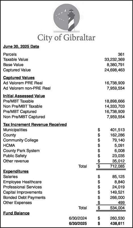 June 30, 2025 Data Parcels 361 Taxable Value 33,232,369 Base Value 8,380,791 Captured Value 24,698,463 Captured Values Ad Valorem PRE Real 16,738,909 Ad Valorem non-PRE Real 7,959,554 Initial Assessed Value Pre/MBT Taxable 18,898,666 Non Pre/MBT Taxable 14,333,703 Pre/MBT Captured 16,738,909 Non Pre/MBT Captured 7,959,554 Tax Increment Revenue Received Municipalities $ 401,513 County $ 162,286 Community College $ 79,140 HCMA $ 5,091 County Park System $ 6,008 Public Safety $ 23,035 Other revenue $ 35,012 Total $ 712,085 Expenditures Salaries $ 85,125 Employee Healthcare $ 8,840 Professional Services $ 24,019 Capital Improvements $ 149,521 Bonded Debt Payments $ 266,000 Other Expenses $ 499 Total $ 534,004 Fund Balance 6/30/2024 $ 260,530 6/30/2025 $ 438,611