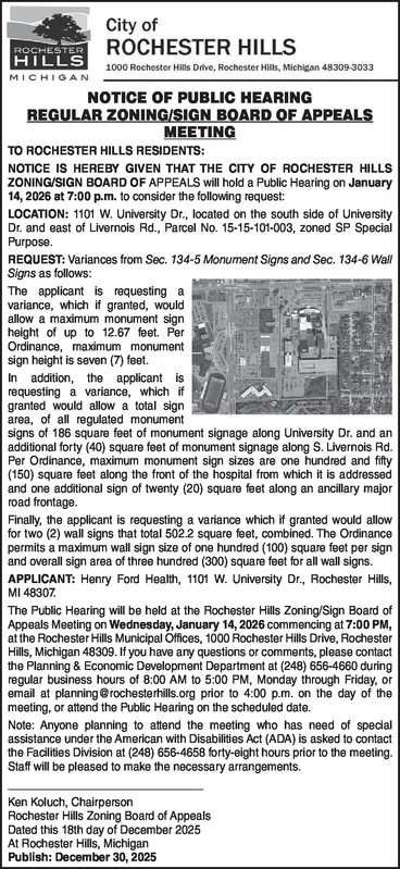 NOTICE OF PUBLIC HEARING REGULAR ZONING/SIGN BOARD OF APPEALS MEETING TO ROCHESTER HILLS RESIDENTS: NOTICE IS HEREBY GIVEN THAT THE CITY OF ROCHESTER HILLS ZONING/SIGN BOARD OF APPEALS will hold a Public Hearing on January 14, 2026 at 7:00 p.m. to consider the following request: LOCATION: 1101 W. University Dr., located on the south side of University Dr. and east of Livernois Rd., Parcel No. 15-15-101- 003, zoned SP Special Purpose. REQUEST: Variances from Sec. 134-5 Monument Signs and Sec. 134-6 Wall Signs as follows: The applicant is requesting a variance, which if granted, would allow a maximum monument sign height of up to 12.67 feet. Per Ordinance, maximum monument sign height is seven (7) feet. In addition, the applicant is requesting a variance, which if granted would allow a total sign area, of all regulated monument signs of 186 square feet of monument signage along University Dr. and an additional forty (40) square feet of monument signage along S. Livernois Rd. Per Ordinance, maximum monument sign sizes are one hundred and fifty (150) square feet along the front of the hospital from which it is addressed and one additional sign of twenty (20) square feet along an ancillary major road frontage. Finally, the applicant is requesting a variance which if granted would allow for two (2) wall signs that total 502.2 square feet, combined. The Ordinance permits a maximum wall sign size of one hundred (100) square feet per sign and overall sign area of three hundred (300) square feet for all wall signs. APPLICANT: Henry Ford Health, 1101 W. University Dr., Rochester Hills, MI 48307. The Public Hearing will be held at the Rochester Hills Zoning/Sign Board of Appeals Meeting on Wednesday, January 14, 2026 commencing at 7:00 PM, at the Rochester Hills Municipal Offices, 1000 Rochester Hills Drive, Rochester Hills, Michigan 48309. If you have any questions or comments, please contact the Planning & Economic Development Department at (248) 656-4660 during regular business hours of 8:00 AM to 5:00 PM, Monday through Friday, or email at planning@rochesterhills.org prior to 4:00 p.m. on the day of the meeting, or attend the Public Hearing on the scheduled date. Note: Anyone planning to attend the meeting who has need of special assistance under the American with Disabilities Act (ADA) is asked to contact the Facilities Division at (248) 656-4658 forty-eight hours prior to the meeting. Staff will be pleased to make the necessary arrangements. Ken Koluch, Chairperson Rochester Hills Zoning Board of Appeals Dated this 18th day of December 2025 At Rochester Hills, Michigan Publish: December 30, 2025