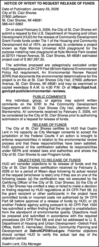 NOTICE OF INTENT TO REQUEST RELEASE OF FUNDS Date of Publication: January 23, 2026 City of St. Clair Shores 27600 Jefferson St. Clair Shores, MI 48081 586-447-3362 On or about February 3,2026 , the City of St. Clair Shores will submit a request to the U.S. Department of Housing and Urban Development (HUD) for the release of Community Development Grant Funds funds under Tile 1 of the Housing and Community Development Act of 1974, as amended, to undertake a project known as Kyte Monroe Universal ADA playground for the purpose installing new playground at Kyte Monroe Park located at 32701 Harper Avenue, St. Clair Shores, MI 48081 estimated project cost of $ 367,287.35. The activities proposed are categorically excluded under HUD regulations at 24 CFR Part 58 from National Environmental Policy Act requirement. An Environmental Review Record (ERR) that documents the environmental determinations for this project is on file at St. Clair Shores City Hall, 27600 Jefferson Avenue, St. Clair Shores, MI 48081 and may be examined or copied weekdays 8 A.M. to 4:30 P.M. Or at https://cpd.hud.gov/cpd-public/environmental- reviews. PUBLIC COMMENTS Any individual, group, or agency may submit written comments on the ERR to the Community Development Department within St. Clair Shores City Hall, attention Ken Blankenship. All comments received by February 2, 2026, will be considered by the City of St. Clair Shores prior to authorizing submission of a request for release of funds. RELEASE OF FUNDS The City of St. Clair Shores certifies to HUD that Dustin Lent in his capacity as City Manager consents to accept the jurisdiction of the Federal Courts if an action is brought to enforce responsibilities in relation to the environmental review process and that these responsibilities have been satisfied. HUD approval of the certification satisfies its responsibilities under NEPA and related laws and authorities and allows the City of St. Clair Shores to use Program funds. OBJECTIONS TO RELEASE OF FUNDS HUD will consider objections to its release of funds and the City of St. Clair Shores certification received by February 3, 2026 or for a period of fifteen days following its actual receipt of the request (whichever is later) only if they are on one of the following bases: (a) the certification was not executed by the Certifying Officer of the City of St. Clair Shores; (b) the City of St. Clair Shores has omitted a step or failed to make a decision or finding required by HUD regulations at 24 CFR Part 58; (c) the grant recipient or other participants in the project have committed funds or incurred costs not authorized by 24 CFR Part 58 before approval of a release of funds by HUD; or (d) another Federal agency acting pursuant to 40 CFR Part 1504 has submitted a written finding that the project is unsatisfactory from the standpoint of environmental quality. Objections must be prepared and submitted in accordance with the required procedures (24 CFR Part 58) and shall be addressed to U. S. Department of Housing and Urban Development –Detroit Field Office, Keith E. Hernandez, Director, Community Planning and Development at DetroitCPD@hud.gov. Potential objectors should contact HUD to verify the actual last day of the objection period. Dustin Lent, City Manager