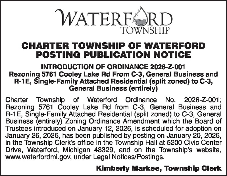 CHARTER TOWNSHIP OF WATERFORD POSTING PUBLICATION NOTICE INTRODUCTION OF ORDINANCE 2026-Z-001 Rezoning 5761 Cooley Lake Rd From C-3, General Business and R-1E, Single-Family Attached Residential (split zoned) to C-3, General Business (entirely) Charter Township of Waterford Ordinance No. 2026-Z-001; Rezoning 5761 Cooley Lake Rd from C-3, General Business and R-1E, Single-Family Attached Residential (split zoned) to C-3, General Business (entirely) Zoning Ordinance Amendment which the Board of Trustees introduced on January 12, 2026, is scheduled for adoption on January 26, 2026, has been published by posting on January 20, 2026, in the Township Clerk’s office in the Township Hall at 5200 Civic Center Drive, Waterford, Michigan 48329, and on the Township’s website, www.waterfordmi.gov, under Legal Notices/Postings. Kimberly Markee, Township Clerk