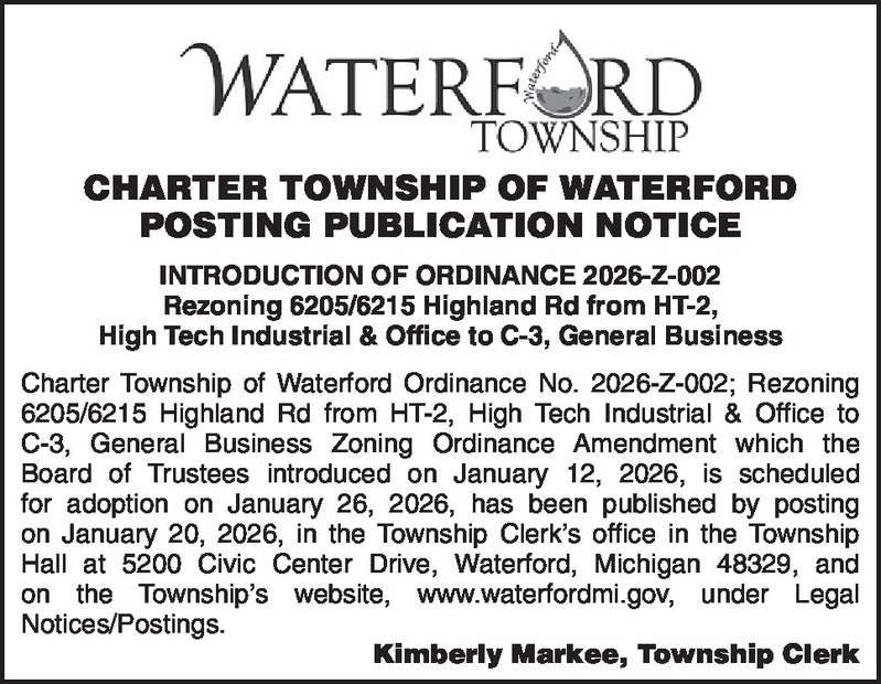 CHARTER TOWNSHIP OF WATERFORD POSTING PUBLICATION NOTICE INTRODUCTION OF ORDINANCE 2026-Z-002 Rezoning 6205/6215 Highland Rd from HT-2, High Tech Industrial & Office to C-3, General Business Charter Township of Waterford Ordinance No. 2026-Z-002; Rezoning 6205/6215 Highland Rd from HT-2, High Tech Industrial & Office to C-3, General Business Zoning Ordinance Amendment which the Board of Trustees introduced on January 12, 2026, is scheduled for adoption on January 26, 2026, has been published by posting on January 20, 2026, in the Township Clerk’s office in the Township Hall at 5200 Civic Center Drive, Waterford, Michigan 48329, and on the Township’s website, www.waterfordmi.gov, under Legal Notices/Postings. Kimberly Markee, Township Clerk