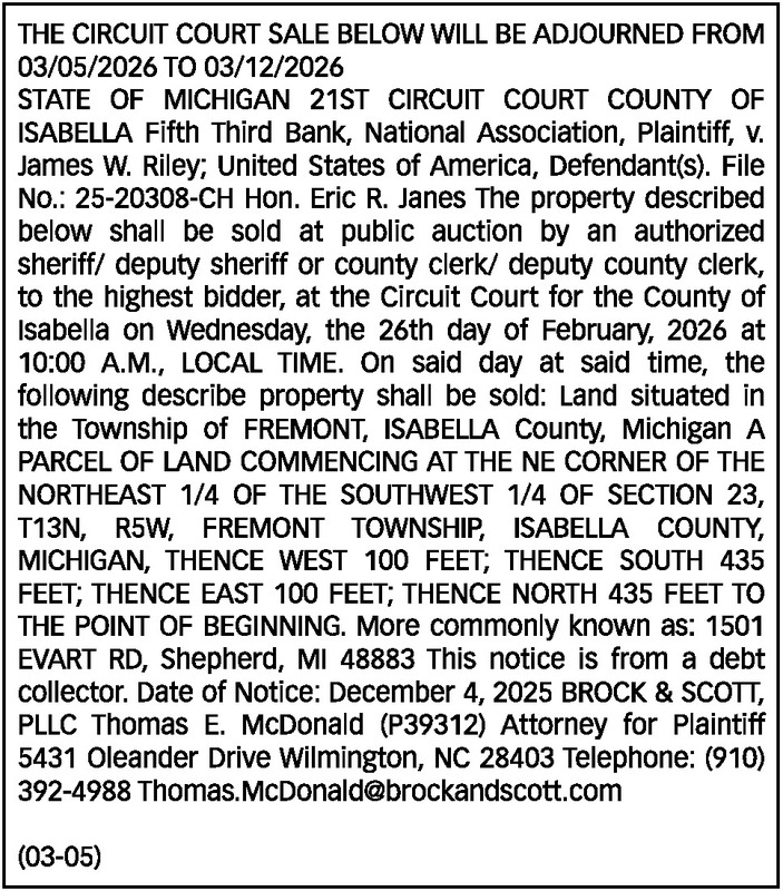THE CIRCUIT COURT SALE BELOW WILL BE ADJOURNED FROM 03/05/2026 TO 03/12/2026 STATE OF MICHIGAN 21ST CIRCUIT COURT COUNTY OF ISABELLA Fifth Third Bank, National Association, Plaintiff, v. James W. Riley; United States of America, Defendant(s). File No.: 25-20308-CH Hon. Eric R. Janes The property described below shall be sold at public auction by an authorized sheriff/ deputy sheriff or county clerk/ deputy county clerk, to the highest bidder, at the Circuit Court for the County of Isabella on Wednesday, the 26th day of February, 2026 at 10:00 A.M., LOCAL TIME. On said day at said time, the following describe property shall be sold: Land situated in the Township of FREMONT, ISABELLA County, Michigan A PARCEL OF LAND COMMENCING AT THE NE CORNER OF THE NORTHEAST 1/4 OF THE SOUTHWEST 1/4 OF SECTION 23, T13N, R5W, FREMONT TOWNSHIP, ISABELLA COUNTY, MICHIGAN, THENCE WEST 100 FEET; THENCE SOUTH 435 FEET; THENCE EAST 100 FEET; THENCE NORTH 435 FEET TO THE POINT OF BEGINNING. More commonly known as: 1501 EVART RD, Shepherd, MI 48883 This notice is from a debt collector. Date of Notice: December 4, 2025 BROCK & SCOTT, PLLC Thomas E. McDonald (P39312) Attorney for Plaintiff 5431 Oleander Drive Wilmington, NC 28403 Telephone: (910) 392-4988 Thomas.McDonald@brockandscott.com (03-05)