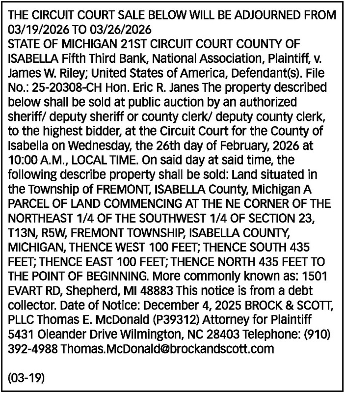 THE CIRCUIT COURT SALE BELOW WILL BE ADJOURNED FROM 03/19/2026 TO 03/26/2026 STATE OF MICHIGAN 21ST CIRCUIT COURT COUNTY OF ISABELLA Fifth Third Bank, National Association, Plaintiff, v. James W. Riley; United States of America, Defendant(s). File No.: 25-20308-CH Hon. Eric R. Janes The property described below shall be sold at public auction by an authorized sheriff/ deputy sheriff or county clerk/ deputy county clerk, to the highest bidder, at the Circuit Court for the County of Isabella on Wednesday, the 26th day of February, 2026 at 10:00 A.M., LOCAL TIME. On said day at said time, the following describe property shall be sold: Land situated in the Township of FREMONT, ISABELLA County, Michigan A PARCEL OF LAND COMMENCING AT THE NE CORNER OF THE NORTHEAST 1/4 OF THE SOUTHWEST 1/4 OF SECTION 23, T13N, R5W, FREMONT TOWNSHIP, ISABELLA COUNTY, MICHIGAN, THENCE WEST 100 FEET; THENCE SOUTH 435 FEET; THENCE EAST 100 FEET; THENCE NORTH 435 FEET TO THE POINT OF BEGINNING. More commonly known as: 1501 EVART RD, Shepherd, MI 48883 This notice is from a debt collector. Date of Notice: December 4, 2025 BROCK & SCOTT, PLLC Thomas E. McDonald (P39312) Attorney for Plaintiff 5431 Oleander Drive Wilmington, NC 28403 Telephone: (910) 392-4988 Thomas.McDonald@brockandscott.com (03-19)