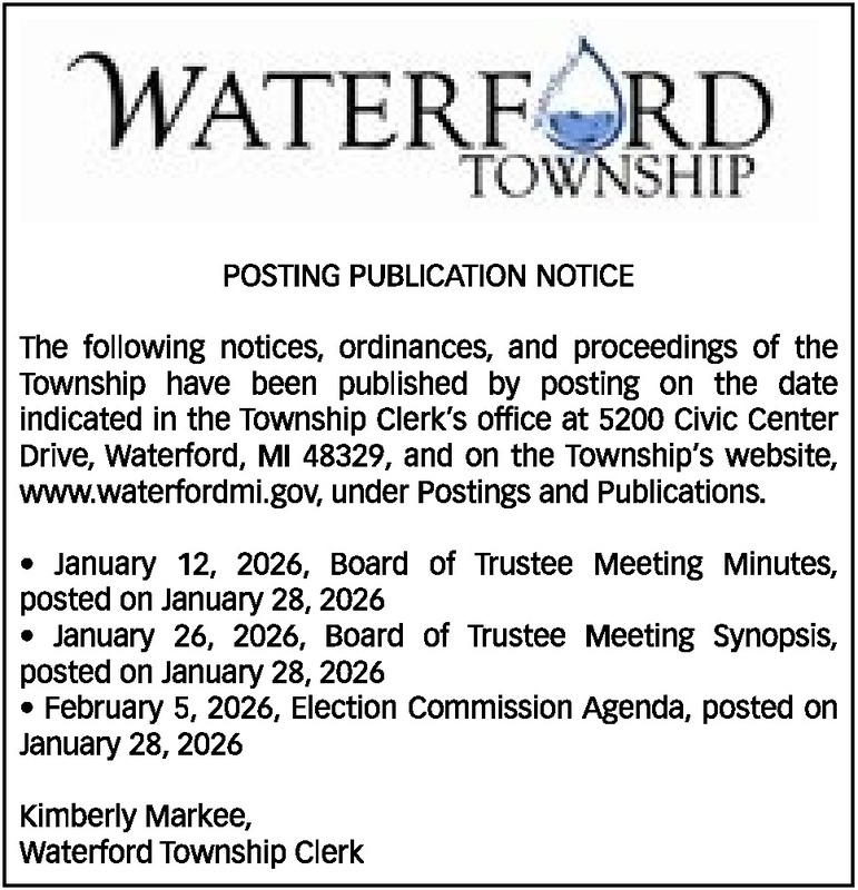 POSTING PUBLICATION NOTICE The following notices, ordinances, and proceedings of the Township have been published by posting on the date indicated in the Township Clerk’s office at 5200 Civic Center Drive, Waterford, MI 48329, and on the Township’s website, www.waterfordmi.gov, under Postings and Publications. • January 12, 2026, Board of Trustee Meeting Minutes, posted on January 28, 2026 • January 26, 2026, Board of Trustee Meeting Synopsis, posted on January 28, 2026 • February 5, 2026, Election Commission Agenda, posted on January 28, 2026 Kimberly Markee, Waterford Township Clerk