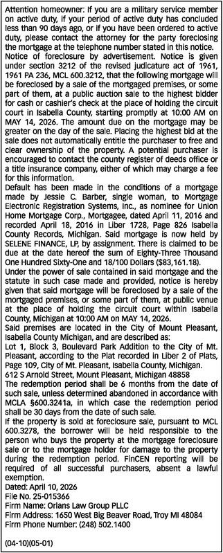 Attention homeowner: If you are a military service member on active duty, if your period of active duty has concluded less than 90 days ago, or if you have been ordered to active duty, please contact the attorney for the party foreclosing the mortgage at the telephone number stated in this notice. Notice of foreclosure by advertisement. Notice is given under section 3212 of the revised judicature act of 1961, 1961 PA 236, MCL 600.3212, that the following mortgage will be foreclosed by a sale of the mortgaged premises, or some part of them, at a public auction sale to the highest bidder for cash or cashier’s check at the place of holding the circuit court in Isabella County, starting promptly at 10:00 AM on MAY 14, 2026. The amount due on the mortgage may be greater on the day of the sale. Placing the highest bid at the sale does not automatically entitle the purchaser to free and clear ownership of the property. A potential purchaser is encouraged to contact the county register of deeds office or a title insurance company, either of which may charge a fee for this information. Default has been made in the conditions of a mortgage made by Jessie C. Barber, single woman, to Mortgage Electronic Registration Systems, Inc., as nominee for Union Home Mortgage Corp., Mortgagee, dated April 11, 2016 and recorded April 18, 2016 in Liber 1728, Page 826 Isabella County Records, Michigan. Said mortgage is now held by SELENE FINANCE, LP, by assignment. There is claimed to be due at the date hereof the sum of Eighty-Three Thousand One Hundred Sixty-One and 18/100 Dollars ($83,161.18). Under the power of sale contained in said mortgage and the statute in such case made and provided, notice is hereby given that said mortgage will be foreclosed by a sale of the mortgaged premises, or some part of them, at public venue at the place of holding the circuit court within Isabella County, Michigan at 10:00 AM on MAY 14, 2026. Said premises are located in the City of Mount Pleasant, Isabella County Michigan, and are described as: Lot 1, Block 3, Boulevard Park Addition to the City of Mt. Pleasant, according to the Plat recorded in Liber 2 of Plats, Page 109, City of Mt. Pleasant, Isabella County, Michigan. 612 S Arnold Street, Mount Pleasant, Michigan 48858 The redemption period shall be 6 months from the date of such sale, unless determined abandoned in accordance with MCLA §600.3241a, in which case the redemption period shall be 30 days from the date of such sale. If the property is sold at foreclosure sale, pursuant to MCL 600.3278, the borrower will be held responsible to the person who buys the property at the mortgage foreclosure sale or to the mortgage holder for damage to the property during the redemption period. FinCEN reporting will be required of all successful purchasers, absent a lawful exemption. Dated: April 10, 2026 File No. 25-015366 Firm Name: Orlans Law Group PLLC Firm Address: 1650 West Big Beaver Road, Troy MI 48084 Firm Phone Number: (248) 502.1400 (04-10)(05-01)