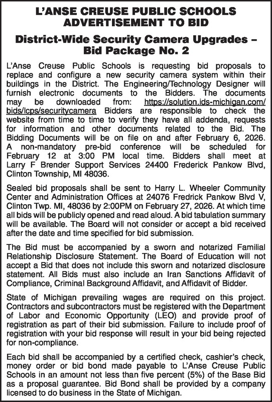 L’ANSE CREUSE PUBLIC SCHOOLS ADVERTISEMENT TO BID District-Wide Security Camera Upgrades – Bid Package No. 2 L’Anse Creuse Public Schools is requesting bid proposals to replace and configure a new security camera system within their buildings in the District. The Engineering/Technology Designer will furnish electronic documents to the Bidders. The documents may be downloaded from: https://solution.ids- michigan.com/bids/lcps/securitycamera Bidders are responsible to check the website from time to time to verify they have all addenda, requests for information and other documents related to the Bid. The Bidding Documents will be on file on and after February 6, 2026. A non-mandatory pre-bid conference will be scheduled for February 12 at 3:00 PM local time. Bidders shall meet at Larry F Brender Support Services 24400 Frederick Pankow Blvd, Clinton Township, MI 48036. Sealed bid proposals shall be sent to Harry L. Wheeler Community Center and Administration Offices at 24076 Fredrick Pankow Blvd V, Clinton Twp. MI, 48036 by 2:00PM on February 27, 2026. At which time all bids will be publicly opened and read aloud. A bid tabulation summary will be available. The Board will not consider or accept a bid received after the date and time specified for bid submission. The Bid must be accompanied by a sworn and notarized Familial Relationship Disclosure Statement. The Board of Education will not accept a Bid that does not include this sworn and notarized disclosure statement. All Bids must also include an Iran Sanctions Affidavit of Compliance, Criminal Background Affidavit, and Affidavit of Bidder. State of Michigan prevailing wages are required on this project. Contractors and subcontractors must be registered with the Department of Labor and Economic Opportunity (LEO) and provide proof of registration as part of their bid submission. Failure to include proof of registration with your bid response will result in your bid being rejected for non-compliance. Each bid shall be accompanied by a certified check, cashier’s check, money order or bid bond made payable to L’Anse Creuse Public Schools in an amount not less than five percent (5%) of the Base Bid as a proposal guarantee. Bid Bond shall be provided by a company licensed to do business in the State of Michigan.