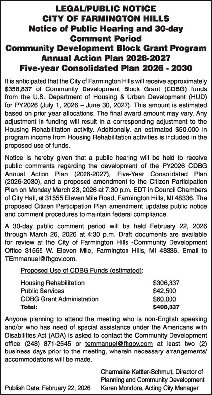 LEGAL/PUBLIC NOTICE CITY OF FARMINGTON HILLS Notice of Public Hearing and 30-day Comment Period Community Development Block Grant Program Annual Action Plan 2026-2027 Five-year Consolidated Plan 2026 - 2030 It is anticipated that the City of Farmington Hills will receive approximately $358,837 of Community Development Block Grant (CDBG) funds from the U.S. Department of Housing & Urban Development (HUD) for PY2026 (July 1, 2026 – June 30, 2027). This amount is estimated based on prior year allocations. The final award amount may vary. Any adjustment in funding will result in a corresponding adjustment to the Housing Rehabilitation activity. Additionally, an estimated $50,000 in program income from Housing Rehabilitation activities is included in the proposed use of funds. Notice is hereby given that a public hearing will be held to receive public comments regarding the development of the PY2026 CDBG Annual Action Plan (2026-2027), Five-Year Consolidated Plan (2026-2030), and a proposed amendment to the Citizen Participation Plan on Monday March 23, 2026 at 7:30 p.m. EDT in Council Chambers of City Hall, at 31555 Eleven Mile Road, Farmington Hills, MI 48336. The proposed Citizen Participation Plan amendment updates public notice and comment procedures to maintain federal compliance. A 30-day public comment period will be held February 22, 2026 through March 26, 2026 at 4:30 p.m. Draft documents are available for review at the City of Farmington Hills -Community Development Office 31555 W. Eleven Mile, Farmington Hills, MI 48336. Email to TEmmanuel@fhgov.com. Proposed Use of CDBG Funds (estimated): Housing Rehabilitation $306,337 Public Services $42,500 CDBG Grant Administration $60,000 Total: $408,837 Anyone planning to attend the meeting who is non-English speaking and/or who has need of special assistance under the Americans with Disabilities Act (ADA) is asked to contact the Community Development office (248) 871-2545 or temmanuel@fhgov.com at least two (2) business days prior to the meeting, wherein necessary arrangements/accommodations will be made. Charmaine Kettler-Schmult, Director of Planning and Community Development Publish Date: February 22, 2026 Karen Mondora, Acting City Manager