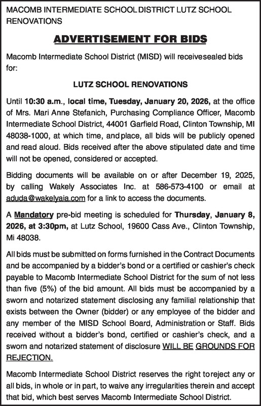MACOMB INTERMEDIATE SCHOOL DISTRICT LUTZ SCHOOL RENOVATIONS ADVERTISEMENT FOR BIDS Macomb Intermediate School District (MISD) will receive sealed bids for: LUTZ SCHOOL RENOVATIONS Until 10:30 a.m., local time, Tuesday, January 20, 2026, at the office of Mrs. Mari Anne Stefanich, Purchasing Compliance Officer, Macomb Intermediate School District, 44001 Garfield Road, Clinton Township, MI 48038-1000, at which time, and place, all bids will be publicly opened and read aloud. Bids received after the above stipulated date and time will not be opened, considered or accepted. Bidding documents will be available on or after December 19, 2025, by calling Wakely Associates Inc. at 586-573-4100 or email at aduda@wakelyaia.com for a link to access the documents. A Mandatory pre-bid meeting is scheduled for Thursday, January 8, 2026, at 3:30pm, at Lutz School, 19600 Cass Ave., Clinton Township, Mi 48038. All bids must be submitted on forms furnished in the Contract Documents and be accompanied by a bidder’s bond or a certified or cashier’s check payable to Macomb Intermediate School District for the sum of not less than five (5%) of the bid amount. All bids must be accompanied by a sworn and notarized statement disclosing any familial relationship that exists between the Owner (bidder) or any employee of the bidder and any member of the MISD School Board, Administration or Staff. Bids received without a bidder’s bond, certified or cashier’s check, and a sworn and notarized statement of disclosure WILL BE GROUNDS FOR REJECTION. Macomb Intermediate School District reserves the right to reject any or all bids, in whole or in part, to waive any irregularities therein and accept that bid, which best serves Macomb Intermediate School District.