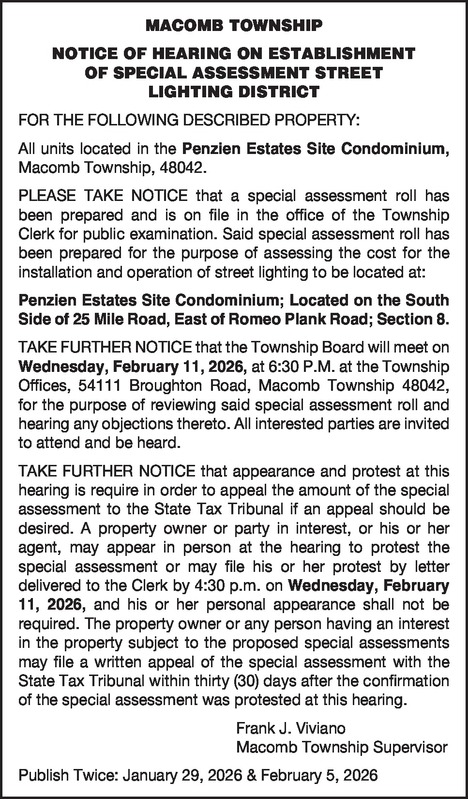 MACOMB TOWNSHIP NOTICE OF HEARING ON ESTABLISHMENT OF SPECIAL ASSESSMENT STREET LIGHTING DISTRICT FOR THE FOLLOWING DESCRIBED PROPERTY: All units located in the Penzien Estates Site Condominium, Macomb Township, 48042. PLEASE TAKE NOTICE that a special assessment roll has been prepared and is on file in the office of the Township Clerk for public examination. Said special assessment roll has been prepared for the purpose of assessing the cost for the installation and operation of street lighting to be located at: Penzien Estates Site Condominium; Located on the South Side of 25 Mile Road, East of Romeo Plank Road; Section 8. TAKE FURTHER NOTICE that the Township Board will meet on Wednesday, February 11, 2026, at 6:30 P.M. at the Township Offices, 54111 Broughton Road, Macomb Township 48042, for the purpose of reviewing said special assessment roll and hearing any objections thereto. All interested parties are invited to attend and be heard. TAKE FURTHER NOTICE that appearance and protest at this hearing is require in order to appeal the amount of the special assessment to the State Tax Tribunal if an appeal should be desired. A property owner or party in interest, or his or her agent, may appear in person at the hearing to protest the special assessment or may file his or her protest by letter delivered to the Clerk by 4:30 p.m. on Wednesday, February 11, 2026, and his or her personal appearance shall not be required. The property owner or any person having an interest in the property subject to the proposed special assessments may file a written appeal of the special assessment with the State Tax Tribunal within thirty (30) days after the confirmation of the special assessment was protested at this hearing. Frank J. Viviano Macomb Township Supervisor Published January 29, 2026 & February 5, 2026 The Macomb Daily