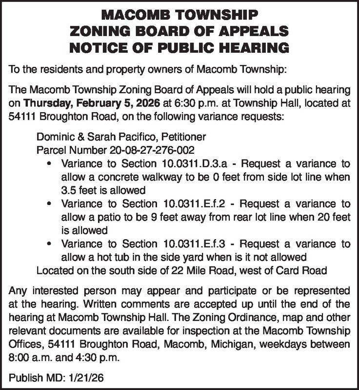 MACOMB TOWNSHIP ZONING BOARD OF APPEALS NOTICE OF PUBLIC HEARING To the residents and property owners of Macomb Township: The Macomb Township Zoning Board of Appeals will hold a public hearing on Thursday, February 5, 2026 at 6:30 p.m. at Township Hall, located at 54111 Broughton Road, on the following variance requests: Dominic & Sarah Pacifico, Petitioner Parcel Number 20-08-27-276-002 Variance to Section 10.0311.D.3.a - Request a variance to allow a concrete walkway to be 0 feet from side lot line when 3.5 feet is allowed Variance to Section 10.0311.E.f.2 - Request a variance to allow a patio to be 9 feet away from rear lot line when 20 feet is allowed Variance to Section 10.0311.E.f.3 – Request a variance to allow a hot tub in the side yard when is it not allowed Located on the south side of 22 Mile Road, west of Card Road Any interested person may appear and participate or be represented at the hearing. Written comments are accepted up until the end of the hearing at Macomb Township Hall. The Zoning Ordinance, map and other relevant documents are available for inspection at the Macomb Township Offices, 54111 Broughton Road, Macomb, Michigan, weekdays between 8:00 a.m. and 4:30 p.m. Publish MD: 1/21/26