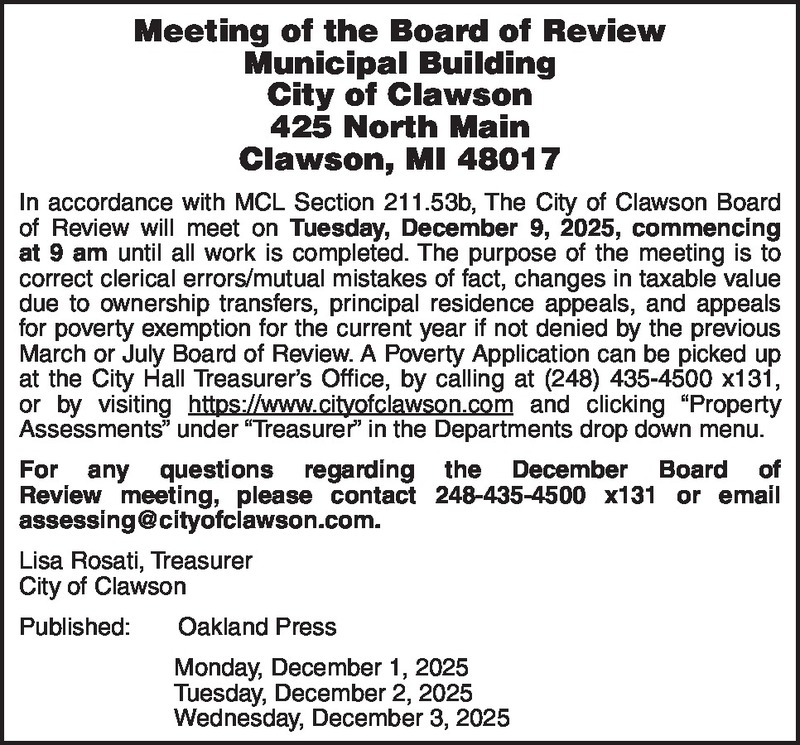 Meeting of the Board of Review Municipal Building City of Clawson 425 North Main Clawson, MI 48017 In accordance with MCL Section 211.53b, The City of Clawson Board of Review will meet on Tuesday, December 9, 2025, commencing at 9 am until all work is completed. The purpose of the meeting is to correct clerical errors/mutual mistakes of fact, changes in taxable value due to ownership transfers, principal residence appeals, and appeals for poverty exemption for the current year if not denied by the previous March or July Board of Review. A Poverty Application can be picked up at the City Hall Treasurer’s Office, by calling at (248) 435-4500 x131, or by visiting https://www.cityofclawson.com and clicking “Property Assessments” under “Treasurer” in the Departments drop down menu. For any questions regarding the December Board of Review meeting, please contact 248-435-4500 x131 or email assessing@cityofclawson.com. Lisa Rosati, Treasurer City of Clawson Published: Oakland Press Monday, December 1, 2025 Tuesday, December 2, 2025 Wednesday, December 3, 2025