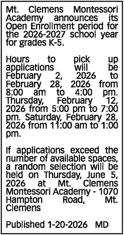 Mt. Clemens Montessori Academy announces its Open Enrollment period for the 2026-2027 school year for grades K-5. Hours to pick up applications will be February 2, 2026 to February 28, 2026 from 8:00 am to 4:00 pm. Thursday, February 12, 2026 from 5:00 pm to 7:00 pm. Saturday, February 28, 2026 from 11:00 am to 1:00 pm. If applications exceed the number of available spaces, a random selection will be held on Thursday, June 5, 2026 at Mt. Clemens Montessori Academy - 1070 Hampton Road, Mt. Clemens Published 1-20-2026 MD