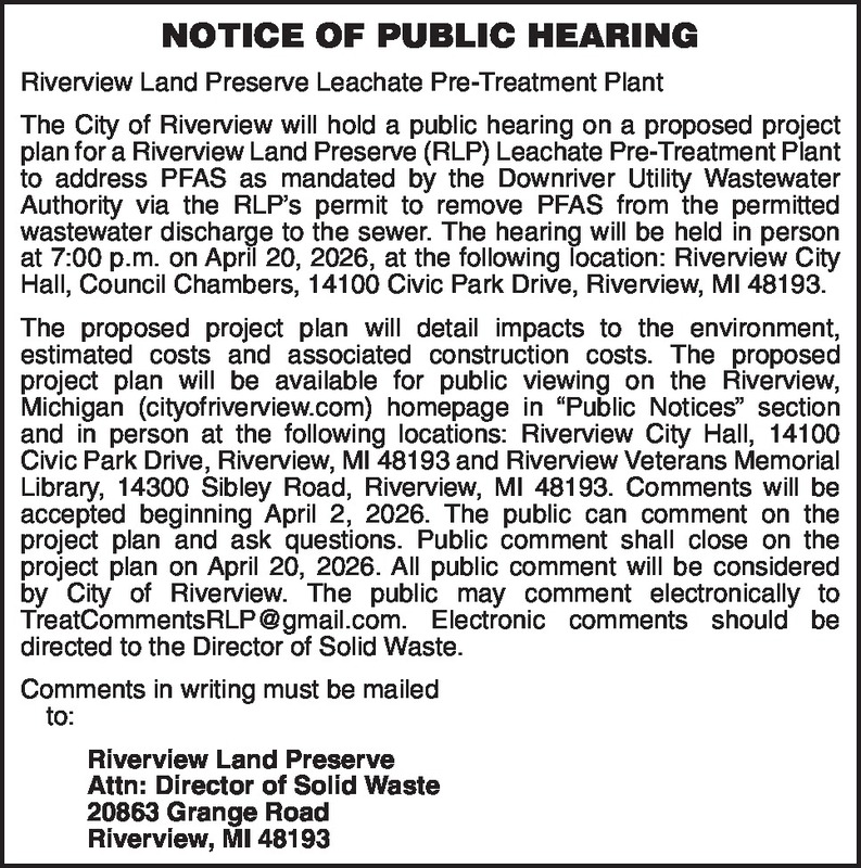 NOTICE OF PUBLIC HEARING Riverview Land Preserve Leachate Pre-Treatment Plant The City of Riverview will hold a public hearing on a proposed project plan for a Riverview Land Preserve (RLP) Leachate Pre-Treatment Plant to address PFAS as mandated by the Downriver Utility Wastewater Authority via the RLP's permit to remove PFAS from the permitted wastewater discharge to the sewer. The hearing will be held in person at 7:00 p.m. on April 20, 2026, at the following location: Riverview City Hall, Council Chambers, 14100 Civic Park Drive, Riverview, MI 48193. The proposed project plan will detail impacts to the environment, estimated costs and associated construction costs. The proposed project plan will be available for public viewing on the Riverview, Michigan (cityofriverview.com) homepage in "Public Notices" section and in person at the following locations: Riverview City Hall, 14100 Civic Park Drive, Riverview, MI 48193 and Riverview Veterans Memorial Library, 14300 Sibley Road, Riverview, MI 48193. Comments will be accepted beginning April 2, 2026. The public can comment on the project plan and ask questions. Public comment shall close on the project plan on April 20, 2026. All public comment will be considered by City of Riverview. The public may comment electronically to TreatCommentsRLP@gmail.com. Electronic comments should be directed to the Director of Solid Waste. Comments in writing must be mailed to: Riverview Land Preserve Attn: Director of Solid Waste 20863 Grange Road Riverview, MI 48193