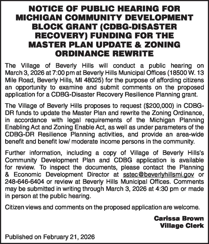 NOTICE OF PUBLIC HEARING FOR MICHIGAN COMMUNITY DEVELOPMENT BLOCK GRANT (CDBG-DISASTER RECOVERY) FUNDING FOR THE MASTER PLAN UPDATE & ZONING ORDINANCE REWRITE The Village of Beverly Hills will conduct a public hearing on March 3, 2026 at 7:00 pm at Beverly Hills Municipal Offices (18500 W. 13 Mile Road, Beverly Hills, MI 48025) for the purpose of affording citizens an opportunity to examine and submit comments on the proposed application for a CDBG-Disaster Recovery Resilience Planning grant. The Village of Beverly Hills proposes to request ($200,000) in CDBG-DR funds to update the Master Plan and rewrite the Zoning Ordinance, in accordance with legal requirements of the Michigan Planning Enabling Act and Zoning Enable Act, as well as under parameters of the CDBG-DR Resilience Planning activities, and provide an area-wide benefit and benefit low/ moderate income persons in the community. Further information, including a copy of Village of Beverly Hills’s Community Development Plan and CDBG application is available for review. To inspect the documents, please contact the Planning & Economic Development Director at sstec@beverlyhillsmi.gov or 248-646-6404 or review at Beverly Hills Municipal Offices. Comments may be submitted in writing through March 3, 2026 at 4:30 pm or made in person at the public hearing. Citizen views and comments on the proposed application are welcome. Carissa Brown Village Clerk Published on February 21, 2026