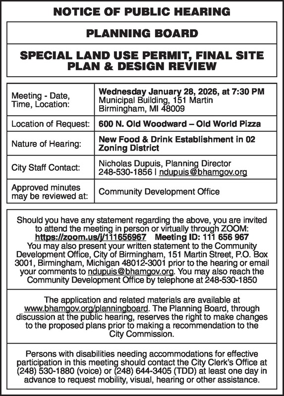 NOTICE OF PUBLIC HEARING PLANNING BOARD SPECIAL LAND USE PERMIT, FINAL SITE PLAN & DESIGN REVIEW Meeting - Date, Time, Location: Wednesday January 28, 2026, at 7:30 PM Municipal Building, 151 Martin Birmingham, MI 48009 Location of Request: 600 N. Old Woodward – Old World Pizza Nature of Hearing: New Food & Drink Establishment in 02 Zoning District City Staff Contact: Nicholas Dupuis, Planning Director