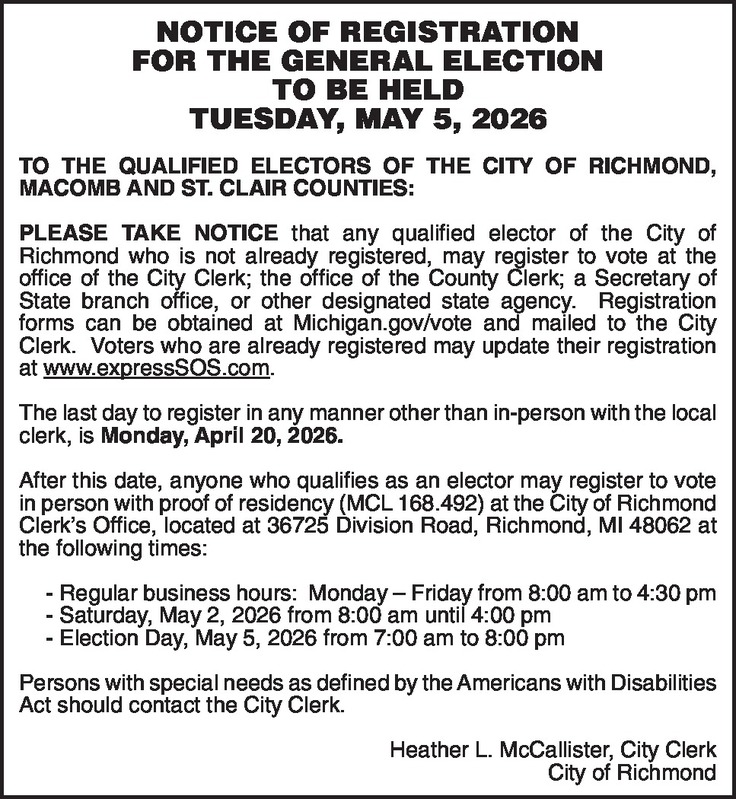 NOTICE OF REGISTRATION FOR THE GENERAL ELECTION TO BE HELD TUESDAY, MAY 5, 2026 TO THE QUALIFIED ELECTORS OF THE CITY OF RICHMOND, MACOMB AND ST. CLAIR COUNTIES: PLEASE TAKE NOTICE that any qualified elector of the City of Richmond who is not already registered, may register to vote at the office of the City Clerk; the office of the County Clerk; a Secretary of State branch office, or other designated state agency. Registration forms can be obtained at Michigan.gov/vote and mailed to the City Clerk. Voters who are already registered may update their registration at www.expressSOS.com . The last day to register in any manner other than in-person with the local clerk, is Monday, April 20, 2026. After this date, anyone who qualifies as an elector may register to vote in person with proof of residency (MCL 168.492) at the City of Richmond Clerk’s Office, located at 36725 Division Road, Richmond, MI 48062 at the following times: - Regular business hours: Monday – Friday from 8:00 am to 4:30 pm - Saturday, May 2, 2026 from 8:00 am until 4:00 pm - Election Day, May 5, 2026 from 7:00 am to 8:00 pm Persons with special needs as defined by the Americans with Disabilities Act should contact the City Clerk. Heather L. McCallister, City Clerk City of Richmond