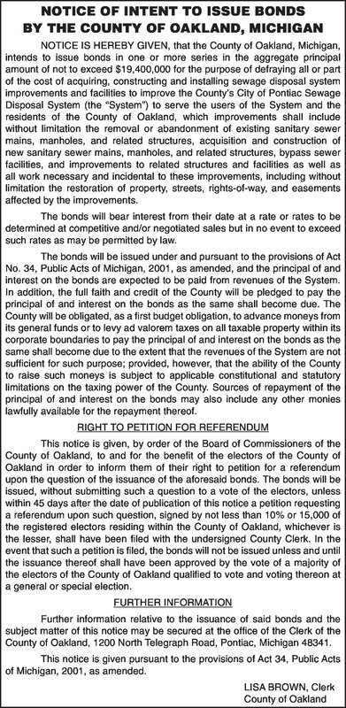 NOTICE OF INTENT TO ISSUE BONDS BY THE COUNTY OF OAKLAND, MICHIGAN NOTICE IS HEREBY GIVEN, that the County of Oakland, Michigan, intends to issue bonds in one or more series in the aggregate principal amount of not to exceed $19,400,000 for the purpose of defraying all or part of the cost of acquiring, constructing and installing sewage disposal system improvements and facilities to improve the County’s City of Pontiac Sewage Disposal System (the “System”) to serve the users of the System and the residents of the County of Oakland, which improvements shall include without limitation the removal or abandonment of existing sanitary sewer mains, manholes, and related structures, acquisition and construction of new sanitary sewer mains, manholes, and related structures, bypass sewer facilities, and improvements to related structures and facilities as well as all work necessary and incidental to these improvements, including without limitation the restoration of property, streets, rights of way, and easements affected by the improvements. The bonds will bear interest from their date at a rate or rates to be determined at competitive and/or negotiated sales but in no event to exceed such rates as may be permitted by law. The bonds will be issued under and pursuant to the provisions of Act No. 34, Public Acts of Michigan, 2001, as amended, and the principal of and interest on the bonds are expected to be paid from revenues of the System. In addition, the full faith and credit of the County will be pledged to pay the principal of and interest on the bonds as the same shall become due. The County will be obligated, as a first budget obligation, to advance moneys from its general funds or to levy ad valorem taxes on all taxable property within its corporate boundaries to pay the principal of and interest on the bonds as the same shall become due to the extent that the revenues of the System are not sufficient for such purpose; provided, however, that the ability of the County to raise such moneys is subject to applicable constitutional and statutory limitations on the taxing power of the County. Sources of repayment of the principal of and interest on the bonds may also include any other monies lawfully available for the repayment thereof. RIGHT TO PETITION FOR REFERENDUM This notice is given, by order of the Board of Commissioners of the County of Oakland, to and for the benefit of the electors of the County of Oakland in order to inform them of their right to petition for a referendum upon the question of the issuance of the aforesaid bonds. The bonds will be issued, without submitting such a question to a vote of the electors, unless within 45 days after the date of publication of this notice a petition requesting a referendum upon such question, signed by not less than 10% or 15,000 of the registered electors residing within the County of Oakland, whichever is the lesser, shall have been filed with the undersigned County Clerk. In the event that such a petition is filed, the bonds will not be issued unless and until the issuance thereof shall have been approved by the vote of a majority of the electors of the County of Oakland qualified to vote and voting thereon at a general or special election. FURTHER INFORMATION Further information relative to the issuance of said bonds and the subject matter of this notice may be secured at the office of the Clerk of the County of Oakland, 1200 North Telegraph Road, Pontiac, Michigan 48341. This notice is given pursuant to the provisions of Act 34, Public Acts of Michigan, 2001, as amended. LISA BROWN, Clerk County of Oakland