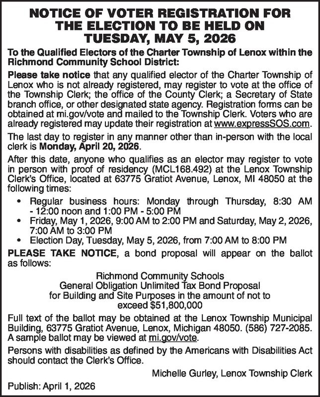 NOTICE OF VOTER REGISTRATION FOR THE ELECTION TO BE HELD ON TUESDAY, MAY 5, 2026 To the Qualified Electors of the Charter Township of Lenox within the Richmond Community School District: Please take notice that any qualified elector of the Charter Township of Lenox who is not already registered, may register to vote at the office of the Township Clerk; the office of the County Clerk; a Secretary of State branch office, or other designated state agency. Registration forms can be obtained at mi.gov/vote and mailed to the Township Clerk. Voters who are already registered may update their registration at www.expressSOS.com. The last day to register in any manner other than in-person with the local clerk is Monday, April 20, 2026. After this date, anyone who qualifies as an elector may register to vote in person with proof of residency (MCL168.492) at the Lenox Township Clerk’s Office, located at 63775 Gratiot Avenue, Lenox, MI 48050 at the following times: • Regular business hours: Monday through Thursday, 8:30 AM - 12:00 noon and 1:00 PM - 5:00 PM • Friday, May 1, 2026, 9:00 AM to 2:00 PM and Saturday, May 2, 2026, 7:00 AM to 3:00 PM • Election Day, Tuesday, May 5, 2026, from 7:00 AM to 8:00 PM PLEASE TAKE NOTICE, a bond proposal will appear on the ballot as follows: Richmond Community Schools General Obligation Unlimited Tax Bond Proposal for Building and Site Purposes in the amount of not to exceed $51,800,000 Full text of the ballot may be obtained at the Lenox Township Municipal Building, 63775 Gratiot Avenue, Lenox, Michigan 48050. (586) 727-2085. A sample ballot may be viewed at mi.gov/vote. Persons with disabilities as defined by the Americans with Disabilities Act should contact the Clerk’s Office. Michelle Gurley, Lenox Township Clerk Publish: April 1, 2026