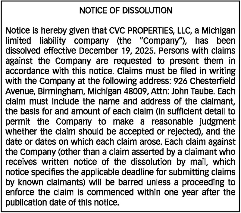 NOTICE OF DISSOLUTION Notice is hereby given that CVC PROPERTIES, LLC, a Michigan limited liability company (the “Company”), has been dissolved effective December 19, 2025. Persons with claims against the Company are requested to present them in accordance with this notice. Claims must be filed in writing with the Company at the following address: 926 Chesterfield Avenue, Birmingham, Michigan 48009, Attn: John Taube. Each claim must include the name and address of the claimant, the basis for and amount of each claim (in sufficient detail to permit the Company to make a reasonable judgment whether the claim should be accepted or rejected), and the date or dates on which each claim arose. Each claim against the Company (other than a claim asserted by a claimant who receives written notice of the dissolution by mail, which notice specifies the applicable deadline for submitting claims by known claimants) will be barred unless a proceeding to enforce the claim is commenced within one year after the publication date of this notice.