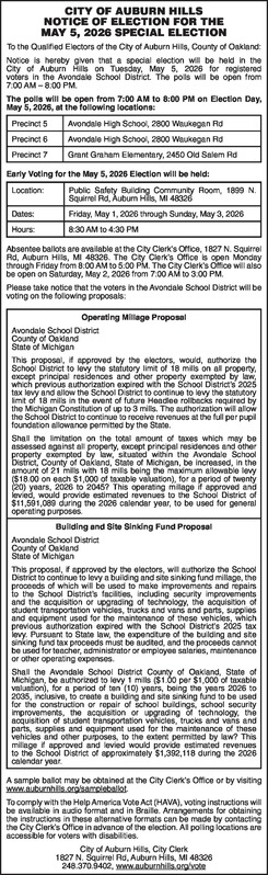 CITY OF AUBURN HILLS NOTICE OF ELECTION FOR THE MAY 5, 2026 SPECIAL ELECTION To the Qualified Electors of the City of Auburn Hills, County of Oakland: Notice is hereby given that a special election will be held in the City of Auburn Hills on Tuesday, May 5, 2026 for registered voters in the Avondale School District. The polls will be open from 7:00 AM – 8:00 PM. The polls will be open from 7:00 AM to 8:00 PM on Election Day, May 5, 2026, at the following locations: Precinct 5 Avondale High School, 2800 Waukegan Rd Precinct 6 Avondale High School, 2800 Waukegan Rd Precinct 7 Grant Graham Elementary, 2450 Old Salem Rd Early Voting for the May 5, 2026 Election will be held: Location: Public Safety Building Community Room, 1899 N. Squirrel Rd, Auburn Hills, MI 48326 Dates: Friday, May 1, 2026 through Sunday, May 3, 2026 Hours: 8:30 AM to 4:30 PM Absentee ballots are available at the City Clerk’s Office, 1827 N. Squirrel Rd, Auburn Hills, MI 48326. The City Clerk’s Office is open Monday through Friday from 8:00 AM to 5:00 PM. The City Clerk’s Office will also be open on Saturday, May 2, 2026 from 7:00 AM to 3:00 PM. Please take notice that the voters in the Avondale School District will be voting on the following proposals: Operating Millage Proposal Avondale School District County of Oakland State of Michigan This proposal, if approved by the electors, would, authorize the School District to levy the statutory limit of 18 mills on all property, except principal residences and other property exempted by law, which previous authorization expired with the School District’s 2025 tax levy and allow the School District to continue to levy the statutory limit of 18 mills in the event of future Headlee rollbacks required by the Michigan Constitution of up to 3 mills. The authorization will allow the School District to continue to receive revenues at the full per pupil foundation allowance permitted by the State. Shall the limitation on the total amount of taxes which may be assessed against all property, except principal residences and other property exempted by law, situated within the Avondale School District, County of Oakland, State of Michigan, be increased, in the amount of 21 mills with 18 mills being the maximum allowable levy ($18.00 on each $1,000 of taxable valuation), for a period of twenty (20) years, 2026 to 2045? This operating millage if approved and levied, would provide estimated revenues to the School District of $11,591,089 during the 2026 calendar year, to be used for general operating purposes. Building and Site Sinking Fund Proposal Avondale School District County of Oakland State of Michigan This proposal, if approved by the electors, will authorize the School District to continue to levy a building and site sinking fund millage, the proceeds of which will be used to make improvements and repairs to the School District’s facilities, including security improvements and the acquisition or upgrading of technology, the acquisition of student transportation vehicles, trucks and vans and parts, supplies and equipment used for the maintenance of these vehicles, which previous authorization expired with the School District’s 2025 tax levy. Pursuant to State law, the expenditure of the building and site sinking fund tax proceeds must be audited, and the proceeds cannot be used for teacher, administrator or employee salaries, maintenance or other operating expenses. Shall the Avondale School District County of Oakland, State of Michigan, be authorized to levy 1 mills ($1.00 per $1,000 of taxable valuation), for a period of ten (10) years, being the years 2026 to 2035, inclusive, to create a building and site sinking fund to be used for the construction or repair of school buildings, school security improvements, the acquisition or upgrading of technology, the acquisition of student transportation vehicles, trucks and vans and parts, supplies and equipment used for the maintenance of these vehicles and other purposes, to the extent permitted by law? This millage if approved and levied would provide estimated revenues to the School District of approximately $1,392,118 during the 2026 calendar year. A sample ballot may be obtained at the City Clerk’s Office or by visiting www.auburnhills.org/sampleballot. To comply with the Help America Vote Act (HAVA), voting instructions will be available in audio format and in Braille. Arrangements for obtaining the instructions in these alternative formats can be made by contacting the City Clerk’s Office in advance of the election. All polling locations are accessible for voters with disabilities. City of Auburn Hills, City Clerk 1827 N. Squirrel Rd, Auburn Hills, MI 48326 248.370.9402, www.auburnhills.org/vote