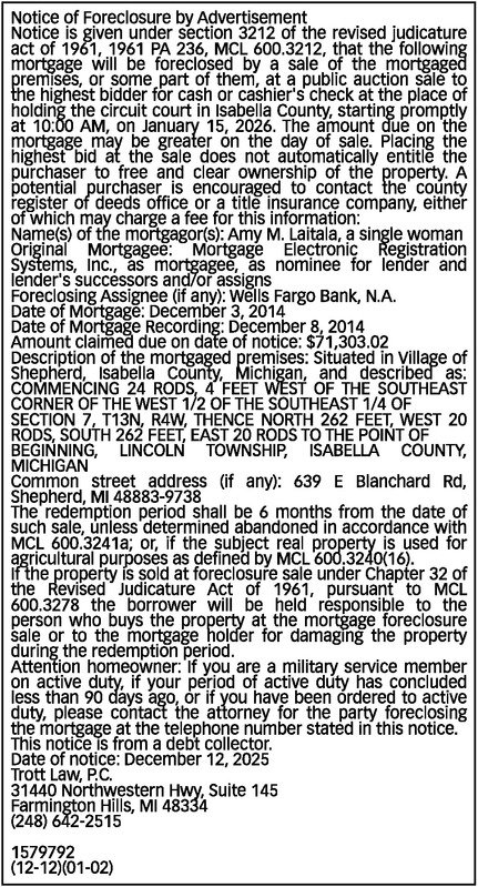 Notice of Foreclosure by Advertisement Notice is given under section 3212 of the revised judicature act of 1961, 1961 PA 236, MCL 600.3212, that the following mortgage will be foreclosed by a sale of the mortgaged premises, or some part of them, at a public auction sale to the highest bidder for cash or cashier's check at the place of holding the circuit court in Isabella County, starting promptly at 10:00 AM, on January 15, 2026. The amount due on the mortgage may be greater on the day of sale. Placing the highest bid at the sale does not automatically entitle the purchaser to free and clear ownership of the property. A potential purchaser is encouraged to contact the county register of deeds office or a title insurance company, either of which may charge a fee for this information: Name(s) of the mortgagor(s): Amy M. Laitala, a single woman Original Mortgagee: Mortgage Electronic Registration Systems, Inc., as mortgagee, as nominee for lender and lender's successors and/or assigns Foreclosing Assignee (if any): Wells Fargo Bank, N.A. Date of Mortgage: December 3, 2014 Date of Mortgage Recording: December 8, 2014 Amount claimed due on date of notice: $71,303.02 Description of the mortgaged premises: Situated in Village of Shepherd, Isabella County, Michigan, and described as: COMMENCING 24 RODS, 4 FEET WEST OF THE SOUTHEAST CORNER OF THE WEST 1/2 OF THE SOUTHEAST 1/4 OF SECTION 7, T13N, R4W, THENCE NORTH 262 FEET, WEST 20 RODS, SOUTH 262 FEET, EAST 20 RODS TO THE POINT OF BEGINNING, LINCOLN TOWNSHIP, ISABELLA COUNTY, MICHIGAN Common street address (if any): 639 E Blanchard Rd, Shepherd, MI 48883-9738 The redemption period shall be 6 months from the date of such sale, unless determined abandoned in accordance with MCL 600.3241a; or, if the subject real property is used for agricultural purposes as defined by MCL 600.3240(16). If the property is sold at foreclosure sale under Chapter 32 of the Revised Judicature Act of 1961, pursuant to MCL 600.3278 the borrower will be held responsible to the person who buys the property at the mortgage foreclosure sale or to the mortgage holder for damaging the property during the redemption period. Attention homeowner: If you are a military service member on active duty, if your period of active duty has concluded less than 90 days ago, or if you have been ordered to active duty, please contact the attorney for the party foreclosing the mortgage at the telephone number stated in this notice. This notice is from a debt collector. Date of notice: December 12, 2025 Trott Law, P.C. 31440 Northwestern Hwy, Suite 145 Farmington Hills, MI 48334 (248) 642-2515 1579792 (12-12)(01-02)