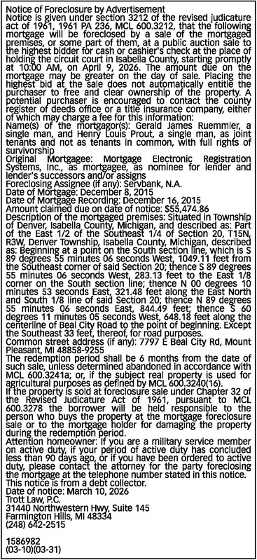 Notice of Foreclosure by Advertisement Notice is given under section 3212 of the revised judicature act of 1961, 1961 PA 236, MCL 600.3212, that the following mortgage will be foreclosed by a sale of the mortgaged premises, or some part of them, at a public auction sale to the highest bidder for cash or cashier's check at the place of holding the circuit court in Isabella County, starting promptly at 10:00 AM, on April 9, 2026. The amount due on the mortgage may be greater on the day of sale. Placing the highest bid at the sale does not automatically entitle the purchaser to free and clear ownership of the property. A potential purchaser is encouraged to contact the county register of deeds office or a title insurance company, either of which may charge a fee for this information: Name(s) of the mortgagor(s): Gerald James Ruemmler, a single man, and Henry Louis Prout, a single man, as joint tenants and not as tenants in common, with full rights of survivorship Original Mortgagee: Mortgage Electronic Registration Systems, Inc., as mortgagee, as nominee for lender and lender's successors and/or assigns Foreclosing Assignee (if any): Servbank, N.A. Date of Mortgage: December 8, 2015 Date of Mortgage Recording: December 16, 2015 Amount claimed due on date of notice: $55,474.86 Description of the mortgaged premises: Situated in Township of Denver, Isabella County, Michigan, and described as: Part of the East 1/2 of the Southeast 1/4 of Section 20, T15N, R3W, Denver Township, Isabella County, Michigan, described as: Beginning at a point on the South section line, which is S 89 degrees 55 minutes 06 seconds West, 1049.11 feet from the Southeast corner of said Section 20; thence S 89 degrees 55 minutes 06 seconds West, 283.13 feet to the East 1/8 corner on the South section line; thence N 00 degrees 10 minutes 53 seconds East, 321.48 feet along the East North and South 1/8 line of said Section 20; thence N 89 degrees 55 minutes 06 seconds East, 844.49 feet; thence S 60 degrees 11 minutes 05 seconds West, 648.18 feet along the centerline of Beal City Road to the point of beginning. Except the Southeast 33 feet, thereof, for road purposes. Common street address (if any): 7797 E Beal City Rd, Mount Pleasant, MI 48858-9255 The redemption period shall be 6 months from the date of such sale, unless determined abandoned in accordance with MCL 600.3241a; or, if the subject real property is used for agricultural purposes as defined by MCL 600.3240(16). If the property is sold at foreclosure sale under Chapter 32 of the Revised Judicature Act of 1961, pursuant to MCL 600.3278 the borrower will be held responsible to the person who buys the property at the mortgage foreclosure sale or to the mortgage holder for damaging the property during the redemption period. Attention homeowner: If you are a military service member on active duty, if your period of active duty has concluded less than 90 days ago, or if you have been ordered to active duty, please contact the attorney for the party foreclosing the mortgage at the telephone number stated in this notice. This notice is from a debt collector. Date of notice: March 10, 2026 Trott Law, P.C. 31440 Northwestern Hwy, Suite 145 Farmington Hills, MI 48334 (248) 642-2515 1586982 (03-10)(03-31)