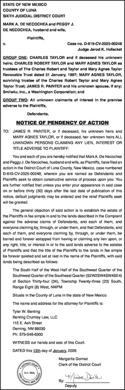 STATE OF NEW MEXICO COUNTY OF LUNA SIXTH JUDICIAL DISTRICT COURT MARK A. DE NECOCHEA and PEGGY J. DE NECOCHEA, husband and wife, Plaintiffs, 6TH JUDICIAL DISTRICT LUNA COUNTY NM FILED IN MY OFFICE 1/13/2026 1:10 PM MARGARITA GOMEZ DISTRICT COURT CLERK Miriam Davila v. Case no. D-619-CV-2025-00248 Judge Jarod K. Hofacket GROUP ONE: CHARLES TAYLOR and if deceased his unknown heirs; CHARLES ROBERT TAYLOR and MARY AGNES TAYLOR as trustees of The Charles Robert and Taylor and Mary Agnes Taylor Revocable Trust dated 31 January, 1997; MARY AGNES TAYLOR, surviving trustee of the Charles Robert Taylor and Mary Agnes Taylor Trust; JAMES R. PAINTER and his unknown spouse, if any; Smile4u, Inc., a Washington Corporation; and GROUP TWO: All unknown claimants of interest in the premise adverse to the Plaintiffs, Defendants. NOTICE OF PENDENCY OF ACTION TO: JAMES R. PAINTER, or if deceased, his unknown heirs and MARY AGNES TAYLOR, or if deceased, her unknown heirs ALL UNKNOWN PERSONS CLAIMING ANY LIEN, INTEREST OR TITLE ADVERSE TO PLAINTIFF: You and each of you are hereby notified that Mark A. De Necochea and Peggy J. De Necochea, husband and wife, as Plaintiffs, have filed an action in the District Court of Luna County, New Mexico, case numbered D-619-CV-2025-00248, wherein you are named as Defendants and Plaintiffs seek to obtain constructive service of process upon you. You are further notified that unless you enter your appearance in said case on or before thirty (30) days after the last date of publication of this notice, default judgments may be entered and the relief Plaintiffs seek will be granted. The general objection of said action is to establish the estate of the Plaintiffs in fee simple in and to the lands described in the Complaint against the adverse claims of Defendants, and each of them, and everyone claiming by, through, or under them, and that Defendants, and each of them, and everyone claiming by, through, or under them, be barred and forever estopped from having or claiming any lien upon, or any right, title, or interest in or to the said lands adverse to the estates of Plaintiffs and that the title of the Plaintiffs to the lands in fee simple be forever quieted and set at rest in the name of the Plaintiffs, with said lands being described as follows: The South Half of the West Half of the Southwest Quarter of the Southwest Quarter of the Southeast Quarter (S2W2SW4SW4SE4) of Section Thirty-four (34), Township Twenty-three (23) South, Range Eight (8) West, NMPM Situate in the County of Luna in the state of New Mexico The name and address for the attorney for Plaintiffs is: Tyler W. Benting Benting Crumley Law, LLC 115 E. Ash Street Deming, NM 88030 Ph: 575-546-6300 WITNESS our hands and seal of this Court. 13th January 2026 === DATED this day of , 2025. Margarita Gomez Clerk of the District Court By: Deputy
