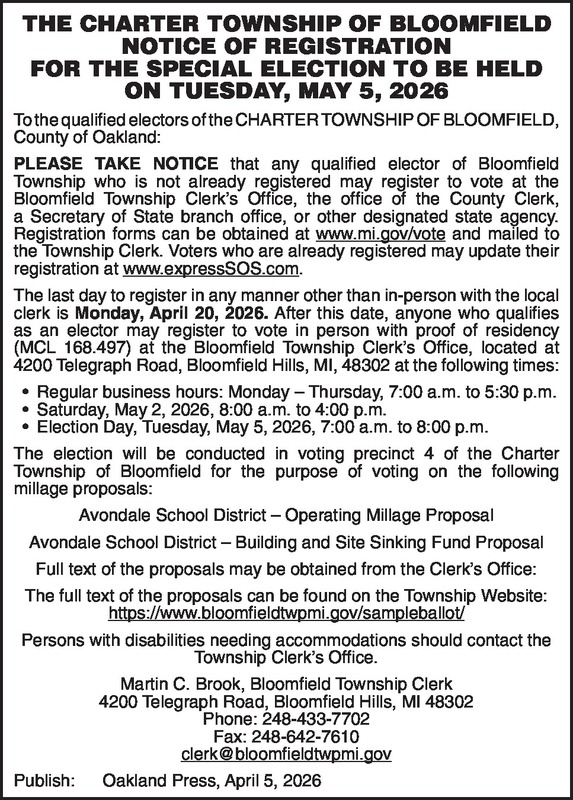 THE CHARTER TOWNSHIP OF BLOOMFIELD NOTICE OF REGISTRATION FOR THE SPECIAL ELECTION TO BE HELD ON TUESDAY, MAY 5, 2026 To the qualified electors of the CHARTER TOWNSHIP OF BLOOMFIELD, County of Oakland: PLEASE TAKE NOTICE that any qualified elector of Bloomfield Township who is not already registered may register to vote at the Bloomfield Township Clerk’s Office, the office of the County Clerk, a Secretary of State branch office, or other designated state agency. Registration forms can be obtained at www.mi.gov/vote and mailed to the Township Clerk. Voters who are already registered may update their registration at www.expressSOS.com. The last day to register in any manner other than in-person with the local clerk is Monday, April 20, 2026. After this date, anyone who qualifies as an elector may register to vote in person with proof of residency (MCL 168.497) at the Bloomfield Township Clerk’s Office, located at 4200 Telegraph Road, Bloomfield Hills, MI, 48302 at the following times: • Regular business hours: Monday – Thursday, 7:00 a.m. to 5:30 p.m. • Saturday, May 2, 2026, 8:00 a.m. to 4:00 p.m. • Election Day, Tuesday, May 5, 2026, 7:00 a.m. to 8:00 p.m. The election will be conducted in voting precinct 4 of the Charter Township of Bloomfield for the purpose of voting on the following millage proposals: Avondale School District – Operating Millage Proposal Avondale School District – Building and Site Sinking Fund Proposal Full text of the proposals may be obtained from the Clerk’s Office: The full text of the proposals can be found on the Township Website: https://www.bloomfieldtwpmi.gov/sampleballot/ Persons with disabilities needing accommodations should contact the Township Clerk’s Office. Martin C. Brook, Bloomfield Township Clerk 4200 Telegraph Road, Bloomfield Hills, MI 48302 Phone: 248-433-7702 Fax: 248-642-7610 clerk@bloomfieldtwpmi.gov Publish: Oakland Press, April 5, 2026