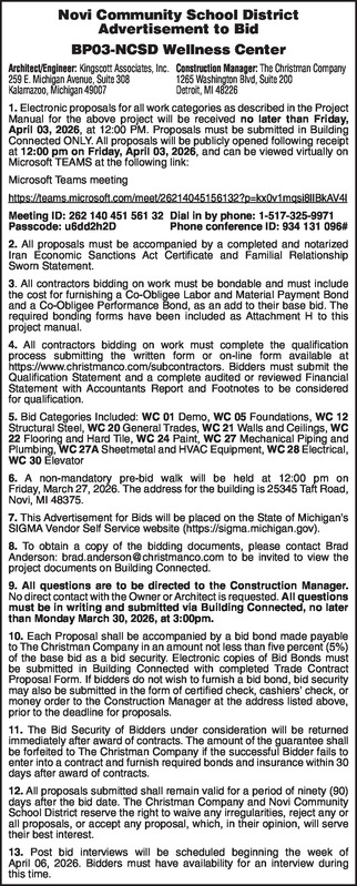 Novi Community School District Advertisement to Bid BP03-NCSD Wellness Center Architect/Engineer: Kingscott Associates, Inc. Construction Manager: The Christman Company 259 E. Michigan Avenue, Suite 308 1265 Washington Blvd, Suite 200 Kalamazoo, Michigan 49007 Detroit, MI 48226 1.Electronic proposals for all work categories as described in the Project Manual for the above project will be received no later than Friday, April 03, 2026, at 12:00 PM. Proposals must be submitted in Building Connected ONLY. All proposals will be publicly opened following receipt at 12:00 pm on Friday, April 03, 2026, and can be viewed virtually on Microsoft TEAMS at the following link: Microsoft Teams meeting https://teams.microsoft.com/meet/26214045156132?p=kx0v1mqsi8lIBkAV4l Meeting ID: 262 140 451 561 32 Dial in by phone: 1-517-325-9971 Passcode: u6dd2h2D Phone conference ID: 934 131 096# 2. All proposals must be accompanied by a completed and notarized Iran Economic Sanctions Act Certificate and Familial Relationship Sworn Statement. 3. All contractors bidding on work must be bondable and must include the cost for furnishing a Co-Obligee Labor and Material Payment Bond and a Co-Obligee Performance Bond, as an add to their base bid. The required bonding forms have been included as Attachment H to this project manual. 4. All contractors bidding on work must complete the qualification process submitting the written form or on-line form available at https://www.christmanco.com/subcontractors. Bidders must submit the Qualification Statement and a complete audited or reviewed Financial Statement with Accountants Report and Footnotes to be considered for qualification. 5. Bid Categories Included: WC 01 Demo, WC 05 Foundations, WC 12 Structural Steel, WC 20 General Trades, WC 21 Walls and Ceilings, WC 22 Flooring and Hard Tile, WC 24 Paint, WC 27 Mechanical Piping and Plumbing, WC 27A Sheetmetal and HVAC Equipment, WC 28 Electrical, WC 30 Elevator 6. A non-mandatory pre-bid walk will be held at 12:00 pm on Friday, March 27, 2026. The address for the building is 25345 Taft Road, Novi, MI 48375. 7. This Advertisement for Bids will be placed on the State of Michigan’s SIGMA Vendor Self Service website (https://sigma.michigan.gov). 8. To obtain a copy of the bidding documents, please contact Brad Anderson: brad.anderson@christmanco.com to be invited to view the project documents on Building Connected. 9.All questions are to be directed to the Construction Manager. No direct contact with the Owner or Architect is requested. All questions must be in writing and submitted via Building Connected, no later than Monday March 30, 2026, at 3:00pm. 10. Each Proposal shall be accompanied by a bid bond made payable to The Christman Company in an amount not less than five percent (5%) of the base bid as a bid security. Electronic copies of Bid Bonds must be submitted in Building Connected with completed Trade Contract Proposal Form. If bidders do not wish to furnish a bid bond, bid security may also be submitted in the form of certified check, cashiers' check, or money order to the Construction Manager at the address listed above, prior to the deadline for proposals. 11. The Bid Security of Bidders under consideration will be returned immediately after award of contracts. The amount of the guarantee shall be forfeited to The Christman Company if the successful Bidder fails to enter into a contract and furnish required bonds and insurance within 30 days after award of contracts. 12. All proposals submitted shall remain valid for a period of ninety (90) days after the bid date. The Christman Company and Novi Community School District reserve the right to waive any irregularities, reject any or all proposals, or accept any proposal, which, in their opinion, will serve their best interest. 13. Post bid interviews will be scheduled beginning the week of April 06, 2026. Bidders must have availability for an interview during this time.