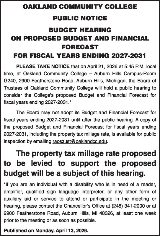 OAKLAND COMMUNITY COLLEGE PUBLIC NOTICE BUDGET HEARING ON PROPOSED BUDGET AND FINANCIAL FORECAST FOR FISCAL YEARS ENDING 2027-2031 PLEASE TAKE NOTICE that on April 21, 2026 at 5:45 P.M. local time, at Oakland Community College – Auburn Hills Campus-Room G240, 2900 Featherstone Road, Auburn Hills, Michigan, the Board of Trustees of Oakland Community College will hold a public hearing to consider the College’s proposed Budget and Financial Forecast for fiscal years ending 2027-2031.* The Board may not adopt its Budget and Financial Forecast for fiscal years ending 2027-2031 until after the public hearing. A copy of the proposed Budget and Financial Forecast for fiscal years ending 2027-2031, including the property tax millage rate, is available for public inspection by emailing raoszust@oaklandcc.edu. The property tax millage rate proposed to be levied to support the proposed budget will be a subject of this hearing. 1 *If you are an individual with a disability who is in need of a reader, amplifier, qualified sign language interpreter, or any other form of auxiliary aid or service to attend or participate in the meeting or hearing, please contact the Chancellor’s Office at (248) 341- 2000 or at 2900 Featherstone Road, Auburn Hills, MI 48326, at least one week prior to the meeting or as soon as possible. Published on Monday, April 13, 2026.