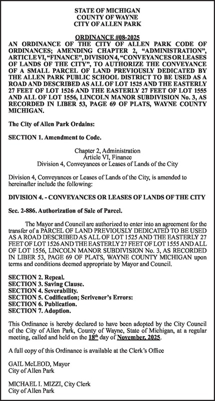 STATE OF MICHIGAN COUNTY OF WAYNE CITY OF ALLEN PARK ORDINANCE #08-2025 AN ORDINANCE OF THE CITY OF ALLEN PARK CODE OF ORDINANCES; AMENDING CHAPTER 2, “ADMINISTRATION”, ARTICLE VI, “FINANCE”, DIVISION 4, “CONVEYANCES OR LEASES OF LANDS OF THE CITY”, TO AUTHORIZE THE CONVEYANCE OF A SMALL PARCEL OF LAND PREVIOUSLY DEDICATED BY THE ALLEN PARK PUBLIC SCHOOL DISTRICT TO BE USED AS A ROAD AND DESCRIBED AS ALL OF LOT 1525 AND THE EASTERLY 27 FEET OF LOT 1526 AND THE EASTERLY 27 FEET OF LOT 1555 AND ALL OF LOT 1556, LINCOLN MANOR SUBDIVISION No. 3, AS RECORDED IN LIBER 53, PAGE 69 OF PLATS, WAYNE COUNTY MICHIGAN. The City of Allen Park Ordains: SECTION 1. Amendment to Code. Chapter 2, Administration Article VI, Finance Division 4, Conveyances or Leases of Lands of the City Division 4, Conveyances or Leases of Lands of the City, is amended to hereinafter include the following: DIVISION 4.- CONVEYANCES OR LEASES OF LANDS OF THE CITY Sec. 2-886. Authorization of Sale of Parcel. The Mayor and Council are authorized to enter into an agreement for the transfer of a PARCEL OF LAND PREVIOUSLY DEDICATED TO BE USED AS A ROAD DESCRIBED AS ALL OF LOT 1525 AND THE EASTERLY 27 FEET OF LOT 1526 AND THE EASTERLY 27 FEET OF LOT 1555 AND ALL OF LOT 1556, LINCOLN MANOR SUBDIVISION No. 3, AS RECORDED IN LIBER 53, PAGE 69 OF PLATS, WAYNE COUNTY MICHIGAN upon terms and conditions deemed appropriate by Mayor and Council. SECTION 2. Repeal. SECTION 3. Saving Clause. SECTION 4. Severability. SECTION 5. Codification; Scrivener's Errors: SECTION 6. Publication. SECTION 7. Adoption. This Ordinance is hereby declared to have been adopted by the City Council of the City of Allen Park, County of Wayne, State of Michigan, at a regular meeting, called and held on the 18th day of November, 2025. A full copy of this Ordinance is available at the Clerk’s Office GAIL McLEOD, Mayor City of Allen Park MICHAEL I. MIZZI, City Clerk City of Allen Park
