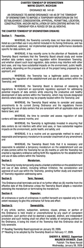CHARTER TOWNSHIP OF BROWNSTOWN WAYNE COUNTY, MICHIGAN ORDINANCE NO. 141-81 AN ORDINANCE TO AMEND ORDINANCE 141-45 OF THE TOWNSHIP OF BROWNSTOWN TO IMPOSE A TEMPORARY MORATORIUM ON THE ESTABLISHMENT, CONSIDERATION, APPROVAL, PERMITTING, LOCATION, CONSTRUCTION, AND/OR INSTALLATION OF DATA CENTERS WITHIN THE TOWNSHIP FOR A PERIOD OF SIX (6) MONTHS. THE CHARTER TOWNSHIP OF BROWNSTOWN ORDAINS: Section 1: Preamble. WHEREAS, the Township currently does not have data processing listed as a permitted use in any district included in its Zoning Ordinance, and has not established, approved, nor implemented appropriate performance standards specific for data centers; and WHEREAS, it has recently come to the attention of Residents and Township Board members that the Township Board should study and review whether data centers require local regulation within Brownstown Township, and whether absent such local regulation, data centers may interfere with other land uses, and may have substantial impacts on the environment, public health, and safety, depending on the proposed size of the project being proposed by an applicant; and WHEREAS, the Township has a legitimate public purpose in assessing the regulation of the establishment and use of data centers within the Township; and WHEREAS, the Township Board is desirous of assessing its regulations to implement an appropriate regulatory approach for addressing potential impacts of data centers while ensuring the productive and healthy development of data centers within the Township, which may include designated districts where data centers may be properly located within the Township; and WHEREAS, the Township Board wishes to consider and assess amendments to its current Zoning Ordinance and the regulations therein regarding the use of data centers that are consistent with all applicable state and federal laws; and WHEREAS, the time to consider and assess regulation of data centers will take several months; and WHEREAS, the Township is legitimately invested in ensuring that data centers do not interfere with other land uses, or have substantial negative impacts on the environment, public health, and safety; and WHEREAS, it is a routine and an appropriate method to enact a reasonable and temporary moratorium to consider enactment of any amendment; and WHEREAS, the Township Board finds that it is necessary and reasonable to establish a temporary moratorium on the establishment and use of data centers within the Township for six (6) months or until the Township has enacted a regulatory ordinance setting forth the regulations for the establishment and use of data centers within the Township. Section 2: Moratorium. The Township hereby temporarily enacts a blanket prohibition on the establishment and use of data centers, including without limitation, the consideration and approval of such use within the Township, pending further study and enactment of Township regulation addressing same. Section 3: Term; Renewal. This Ordinance shall terminate and be of no further effect six (6) months from the effective date of this Ordinance unless the Township Board adopts a resolution extending the moratorium or terminating the moratorium. Section 4: Repealer. All ordinances or parts of ordinances in conflict herewith are repealed only to the extent necessary to give this ordinance full force and effect. Section 5: Severability. If any article, section, subsection, sentence, clause, phrase, or portion of this Ordinance is held invalid or unconstitutional by any court of competent jurisdiction, such portion shall be deemed a separate, distinct, and independent provision and such holding shall not affect the validity of remaining portions of the Ordinance, it being the intent of the Township that this Ordinance shall be fully severable. 1st Reading Township Board approved on January 20, 2026. 2nd Reading to be adopted by the Township Board on February 17, 2026. SHERRY A. BERECZ, Supervisor MAUREEN BRINKER, Clerk Publish: The News Herald Wednesday, January 28, 2026