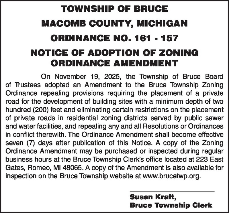 TOWNSHIP OF BRUCE MACOMB COUNTY, MICHIGAN ORDINANCE NO. 161 - 157 NOTICE OF ADOPTION OF ZONING ORDINANCE AMENDMENT On November 19, 2025, the Township of Bruce Board of Trustees adopted an Amendment to the Bruce Township Zoning Ordinance repealing provisions requiring the placement of a private road for the development of building sites with a minimum depth of two hundred (200) feet and eliminating certain restrictions on the placement of private roads in residential zoning districts served by public sewer and water facilities, and repealing any and all Resolutions or Ordinances in conflict therewith. The Ordinance Amendment shall become effective seven (7) days after publication of this Notice. A copy of the Zoning Ordinance Amendment may be purchased or inspected during regular business hours at the Bruce Township Clerk’s office located at 223 East Gates, Romeo, MI 48065. A copy of the Amendment is also available for inspection on the Bruce Township website at www.brucetwp.org. ________________________________ Susan Kraft, Bruce Township Clerk