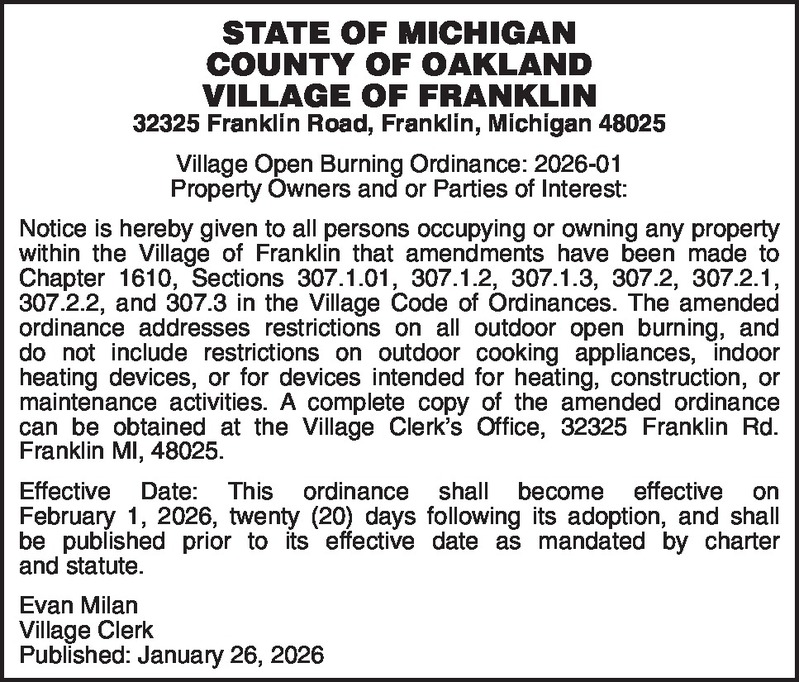 STATE OF MICHIGAN COUNTY OF OAKLAND VILLAGE OF FRANKLIN 32325 Franklin Road, Franklin, Michigan 48025 Village Open Burning Ordinance: 2026-01 Property Owners and or Parties of Interest: Notice is hereby given to all persons occupying or owning any property within the Village of Franklin that amendments have been made to Chapter 1610, Sections 307.1.01, 307.1.2, 307.1.3, 307.2, 307.2.1, 307.2.2, and 307.3 in the Village Code of Ordinances. The amended ordinance addresses restrictions on all outdoor open burning, and do not include restrictions on outdoor cooking appliances, indoor heating devices, or for devices intended for heating, construction, or maintenance activities. A complete copy of the amended ordinance can be obtained at the Village Clerk's Office, 32325 Franklin Rd. Franklin MI, 48025. Effective Date: This ordinance shall become effective on February 1, 2026, twenty (20) days following its adoption, and shall be published prior to its effective date as mandated by charter and statute. Evan Milan Village Clerk Published: January 26, 2026
