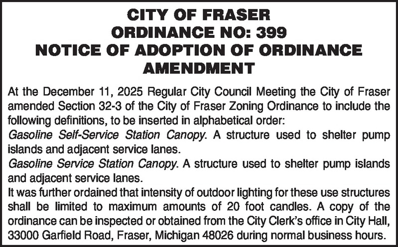 CITY OF FRASER ORDINANCE NO: 399 NOTICE OF ADOPTION OF ORDINANCE AMENDMENT At the December 11, 2025 Regular City Council Meeting the City of Fraser amended Section 32-3 of the City of Fraser Zoning Ordinance to include the following definitions, to be inserted in alphabetical order: Gasoline Self-Service Station Canopy. A structure used to shelter pump islands and adjacent service lanes. Gasoline Service Station Canopy. A structure used to shelter pump islands and adjacent service lanes. It was further ordained that intensity of outdoor lighting for these use structures shall be limited to maximum amounts of 20 foot candles. A copy of the ordinance can be inspected or obtained from the City Clerk’s office in City Hall, 33000 Garfield Road, Fraser, Michigan 48026 during normal business hours.