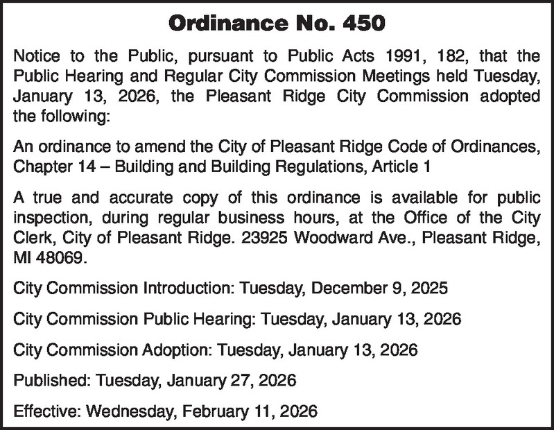 Ordinance No. 450 Notice to the Public, pursuant to Public Acts 1991, 182, that the Public Hearing and Regular City Commission Meetings held Tuesday, January 13, 2026, the Pleasant Ridge City Commission adopted the following: An ordinance to amend the City of Pleasant Ridge Code of Ordinances, Chapter 14 – Building and Building Regulations, Article 1 A true and accurate copy of this ordinance is available for public inspection, during regular business hours, at the Office of the City Clerk, City of Pleasant Ridge. 23925 Woodward Ave., Pleasant Ridge, MI 48069. City Commission Introduction: Tuesday, December 9, 2025 City Commission Public Hearing: Tuesday, January 13, 2026 City Commission Adoption: Tuesday, January 13, 2026 Published: Tuesday, January 27, 2026 Effective: Tuesday, February 11, 2026