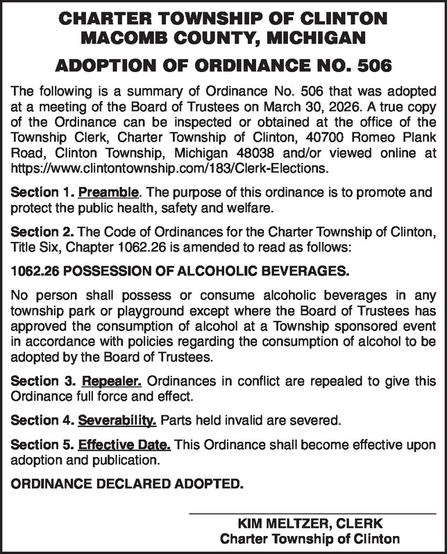 CHARTER TOWNSHIP OF CLINTON MACOMB COUNTY, MICHIGAN ADOPTION OF ORDINANCE NO. 506 The following is a summary of Ordinance No. 506 that was adopted at a meeting of the Board of Trustees on March 30, 2026. A true copy of the Ordinance can be inspected or obtained at the office of the Township Clerk, Charter Township of Clinton, 40700 Romeo Plank Road, Clinton Township, Michigan 48038 and/or viewed online at https://www.clintontownship.com/183/Clerk-Elections. . Section 1. Preamble. The purpose of this ordinance is to promote and protect the public health, safety and welfare. Section 2. The Code of Ordinances for the Charter Township of Clinton, Title Six, Chapter 1062.26 is amended to read as follows: 1062.26 POSSESSION OF ALCOHOLIC BEVERAGES. No person shall possess or consume alcoholic beverages in any township park or playground except where the Board of Trustees has approved the consumption of alcohol at a Township sponsored event in accordance with policies regarding the consumption of alcohol to be adopted by the Board of Trustees. Section 3. Repealer. Ordinances in conflict are repealed to give this Ordinance full force and effect. Section 4. Severability. Parts held invalid are severed. Section 5. Effective Date. This Ordinance shall become effective upon adoption and publication. ORDINANCE DECLARED ADOPTED. _________________________________ KIM MELTZER, CLERK Charter Township of Clinton