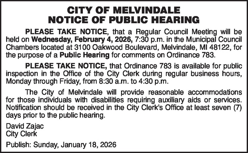 CITY OF MELVINDALE NOTICE OF PUBLIC HEARING PLEASE TAKE NOTICE, that a Regular Council Meeting will be held on Wednesday, February 4, 2026, 7:30 p.m. in the Municipal Council Chambers located at 3100 Oakwood Boulevard, Melvindale, MI 48122, for the purpose of a Public Hearing for comments on Ordinance 783. PLEASE TAKE NOTICE, that Ordinance 783 is available for public inspection in the Office of the City Clerk during regular business hours, Monday through Friday, from 8:30 a.m. to 4:30 p.m. The City of Melvindale will provide reasonable accommodations for those individuals with disabilities requiring auxiliary aids or services. Notification should be received in the City Clerk’s Office at least seven (7) days prior to the public hearing. David Zajac City Clerk Publish: Sunday, January 18, 2026