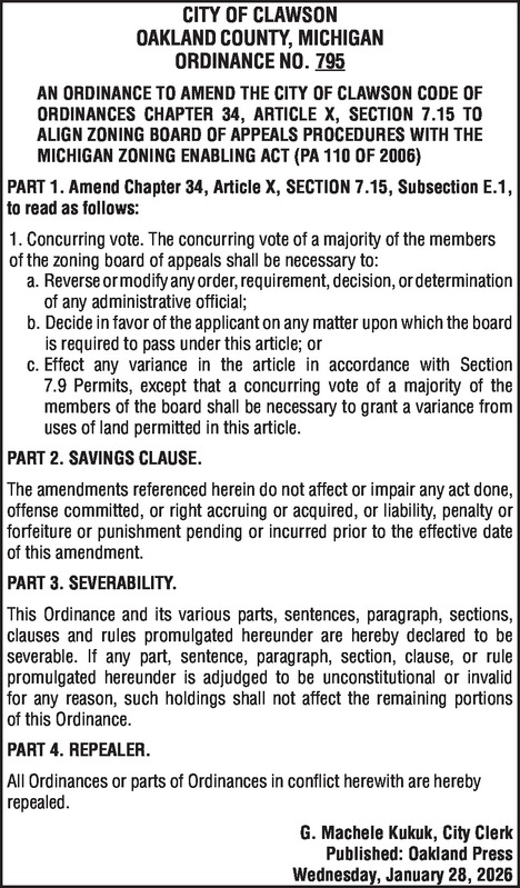 CITY OF CLAWSON OAKLAND COUNTY, MICHIGAN ORDINANCE NO. 795 AN ORDINANCE TO AMEND THE CITY OF CLAWSON CODE OF ORDINANCES CHAPTER 34, ARTICLE X, SECTION 7.15 TO ALIGN ZONING BOARD OF APPEALS PROCEDURES WITH THE MICHIGAN ZONING ENABLING ACT (PA 110 OF 2006) PART 1. Amend Chapter 34, Article X, SECTION 7.15, Subsection E.1, to read as follows: 1. Concurring vote. The concurring vote of a majority of the members of the zoning board of appeals shall be necessary to: a. Reverse or modify any order, requirement, decision, or determination of any administrative official; b. Decide in favor of the applicant on any matter upon which the board is required to pass under this article; or c. Effect any variance in the article in accordance with Section 7.9 Permits, except that a concurring vote of a majority of the members of the board shall be necessary to grant a variance from uses of land permitted in this article. PART 2. SAVINGS CLAUSE. The amendments referenced herein do not affect or impair any act done, offense committed, or right accruing or acquired, or liability, penalty or forfeiture or punishment pending or incurred prior to the effective date of this amendment. PART 3. SEVERABILITY. This Ordinance and its various parts, sentences, paragraph, sections, clauses and rules promulgated hereunder are hereby declared to be severable. If any part, sentence, paragraph, section, clause, or rule promulgated hereunder is adjudged to be unconstitutional or invalid for any reason, such holdings shall not affect the remaining portions of this Ordinance. PART 4. REPEALER. All Ordinances or parts of Ordinances in conflict herewith are hereby repealed. G. Machele Kukuk, City Clerk Published: Oakland Press Wednesday, January 28, 2026
