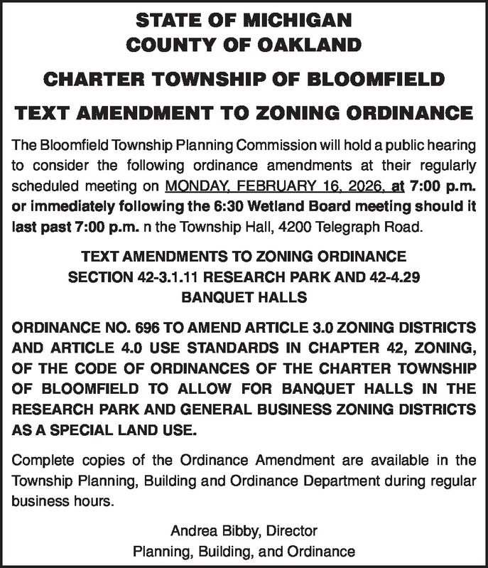 STATE OF MICHIGAN COUNTY OF OAKLAND CHARTER TOWNSHIP OF BLOOMFIELD TEXT AMENDMENT TO ZONING ORDINANCE The Bloomfield Township Planning Commission will hold a public hearing to consider the following ordinance amendments at their regularly scheduled meeting on MONDAY, FEBRUARY 16, 2026, at 7:00 p.m. or immediately following the 6:30 Wetland Board meeting should it last past 7:00 p.m. n the Township Hall, 4200 Telegraph Road. TEXT AMENDMENTS TO ZONING ORDINANCE SECTION 42-3.1.11 RESEARCH PARK AND 42-4.29 BANQUET HALLS ORDINANCE NO. 696 TO AMEND ARTICLE 3.0 ZONING DISTRICTS AND ARTICLE 4.0 USE STANDARDS IN CHAPTER 42, ZONING, OF THE CODE OF ORDINANCES OF THE CHARTER TOWNSHIP OF BLOOMFIELD TO ALLOW FOR BANQUET HALLS IN THE RESEARCH PARK AND GENERAL BUSINESS ZONING DISTRICTS AS A SPECIAL LAND USE. Complete copies of the Ordinance Amendment are available in the Township Planning, Building and Ordinance Department during regular business hours. Andrea Bibby, Director Planning, Building, and Ordinance