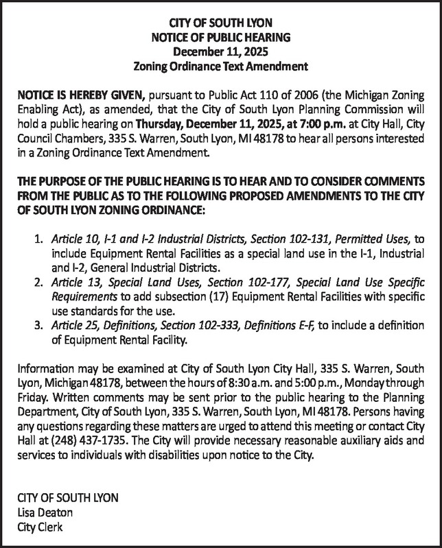 CITY OF SOUTH LYON NOTICE OF PUBLIC HEARING December 11, 2025 Zoning Ordinance Text Amendment NOTICE IS HEREBY GIVEN, pursuant to Public Act 110 of 2006 (the Michigan Zoning Enabling Act), as amended, that the City of South Lyon Planning Commission will hold a public hearing on Thursday, December 11, 2025, at 7:00 p.m. at City Hall, City Council Chambers, 335 S. Warren, South Lyon, MI 48178 to hear all persons interested in a Zoning Ordinance Text Amendment. THE PURPOSE OF THE PUBLIC HEARING IS TO HEAR AND TO CONSIDER COMMENTS FROM THE PUBLIC AS TO THE FOLLOWING PROPOSED AMENDMENTS TO THE CITY OF SOUTH LYON ZONING ORDINANCE: 1. Article 10, I-1 and I-2 Industrial Districts, Section 102-131, Permitted Uses, to include Equipment Rental Facilities as a special land use in the I-1, Industrial and I-2, General Industrial Districts. 2. Article 13, Special Land Uses, Section 102-177, Special Land Use Specific Requirements to add subsection (17) Equipment Rental Facilities with specific use standards for the use. 3. Article 25, Definitions, Section 102-333, Definitions E-F, to include a definition of Equipment Rental Facility. Information may be examined at City of South Lyon City Hall, 335 S. Warren, South Lyon, Michigan 48178, between the hours of 8:30 a.m. and 5:00 p.m., Monday through Friday. Written comments may be sent prior to the public hearing to the Planning Department, City of South Lyon, 335 S. Warren, South Lyon, MI 48178. Persons having any questions regarding these matters are urged to attend this meeting or contact City Hall at (248)437-1735. The City will provide necessary reasonable auxiliary aids and services to individuals with disabilities upon notice to the City. CITY OF SOUTH LYON Lisa Deaton City Clerk