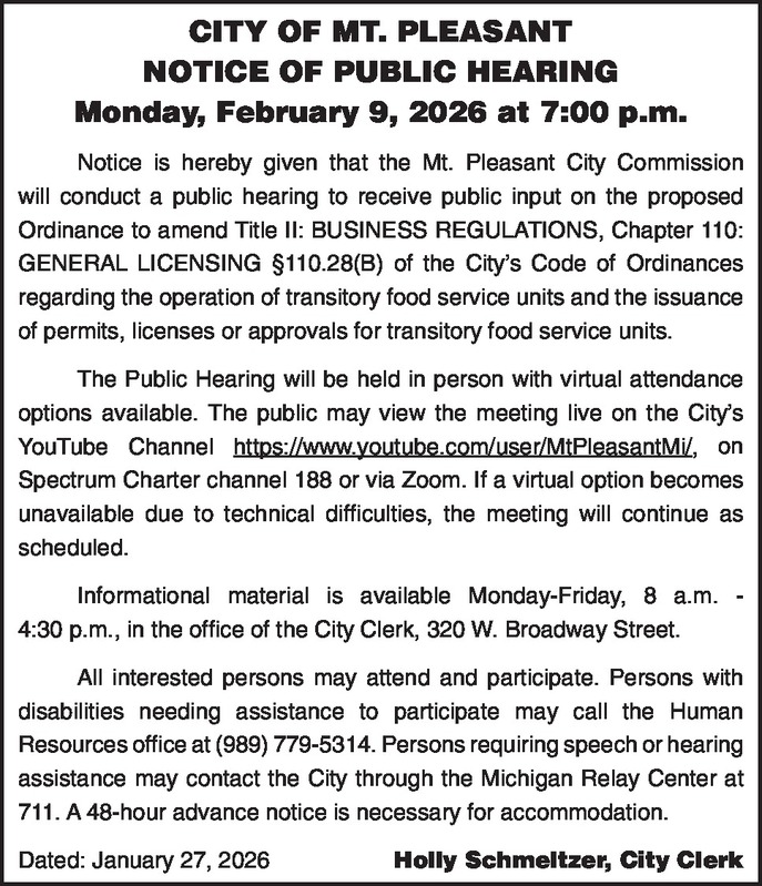 CITY OF MT. PLEASANT NOTICE OF PUBLIC HEARING Monday, February 9, 2026 at 7:00 p.m. Notice is hereby given that the Mt. Pleasant City Commission will conduct a public hearing to receive public input on the proposed Ordinance to amend Title II: BUSINESS REGULATIONS, Chapter 110: GENERAL LICENSING §110.28(B) of the City’s Code of Ordinances regarding the operation of transitory food service units and the issuance of permits, licenses or approvals for transitory food service units. The Public Hearing will be held in person with virtual attendance options available. The public may view the meeting live on the City’s YouTube Channel https://www.youtube.com/user/MtPleasantMi/, on Spectrum Charter channel 188 or via Zoom. If a virtual option becomes unavailable due to technical difficulties, the meeting will continue as scheduled. Informational material is available Monday-Friday, 8 a.m. - 4:30 p.m., in the office of the City Clerk, 320 W. Broadway Street. All interested persons may attend and participate. Persons with disabilities needing assistance to participate may call the Human Resources office at (989) 779-5314. Persons requiring speech or hearing assistance may contact the City through the Michigan Relay Center at 711. A 48-hour advance notice is necessary for accommodation. Dated: Feb 2, 2026 Holly Schmeltzer, City Clerk