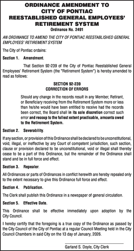 PROPOSED ORDINANCE AMENDMENT TO CITY OF PONTIAC REESTABLISHED GENERAL EMPLOYEES’ RETIREMENT SYSTEM Ordinance No. 2491 AN ORDINANCE TO AMEND THE CITY OF PONTIAC REESTABLISHED GENERAL EMPLOYEES’ RETIREMENT SYSTEM The City of Pontiac ordains: Section 1. Amendment. That Section 92-239 of the City of Pontiac Reestablished General Employees’ Retirement System (the “Retirement System”) is hereby amended to read as follows: SECTION 92-239 CORRECTION OF ERRORS Should any change in the records result in any Member, Retirant, or Beneficiary receiving from the Retirement System more or less than he/she would have been entitled to receive had the records been correct, the Board shall in its sole discretion correct such error and recoup to the fullest extent practicable, amounts owed to the Retirement System., and as far as practicable shall adjust the payment in such manner that the Actuarial Equivalent of the benefit to which the said Member, Retirant, or Beneficiary was correctly entitled shall be paid. Section 2. Severability. If any section, or provision of this Ordinance shall be declared to be unconstitutional, void, illegal, or ineffective by any Court of competent jurisdiction, such section, clause or provision declared to be unconstitutional, void or illegal shall thereby cease to be a part of this Ordinance, but the remainder of the Ordinance shall stand and be in full force and effect. Section 3. Repealer. All Ordinances or parts of Ordinances in conflict herewith are hereby repealed only to the extent necessary to give this Ordinance full force and effect. Section 4. Publication. The Clerk shall publish this Ordinance in a newspaper of general circulation. Section 5. Effective Date. This Ordinance shall be effective immediately upon adoption by the City Council. I hereby certify that the foregoing is a true copy of the Ordinance as passed by the City Council of the City of Pontiac at a regular Council Meeting held in the City Council Chambers in said City on the 13 day of January, 2026. _____________________________ Garland S. Doyle, City Clerk