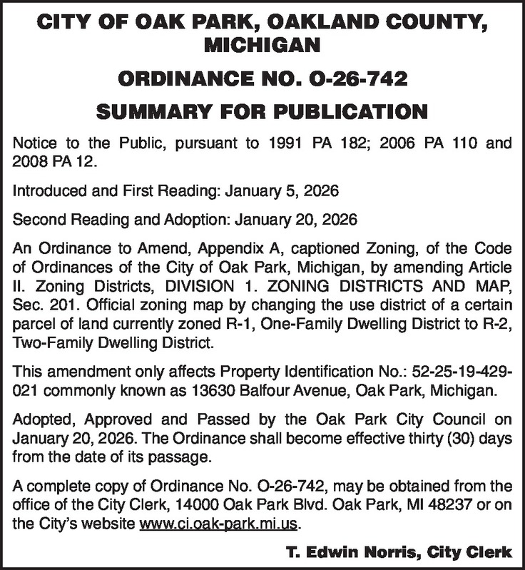 CITY OF OAK PARK, OAKLAND COUNTY, MICHIGAN ORDINANCE NO. O-26-742 SUMMARY FOR PUBLICATION Notice to the Public, pursuant to 1991 PA 182; 2006 PA 110 and 2008 PA 12. Introduced and First Reading: January 5, 2026 Second Reading and Adoption: January 20, 2026 An Ordinance to Amend, Appendix A, captioned Zoning, of the Code of Ordinances of the City of Oak Park, Michigan, by amending Article II. Zoning Districts, DIVISION 1. ZONING DISTRICTS AND MAP, Sec. 201. Official zoning map by changing the use district of a certain parcel of land currently zoned R-1, One-Family Dwelling District to R-2, Two-Family Dwelling District. This amendment only affects Property Identification No.: 52-25-19-429-021 commonly known as 13630 Balfour Avenue, Oak Park, Michigan. Adopted, Approved and Passed by the Oak Park City Council on January 20, 2026. The Ordinance shall become effective thirty (30) days from the date of its passage. A complete copy of Ordinance No. O-26-742, may be obtained from the office of the City Clerk, 14000 Oak Park Blvd. Oak Park, MI 48237 or on the City’s website www.ci.oak-park.mi.us. T. Edwin Norris, City Clerk