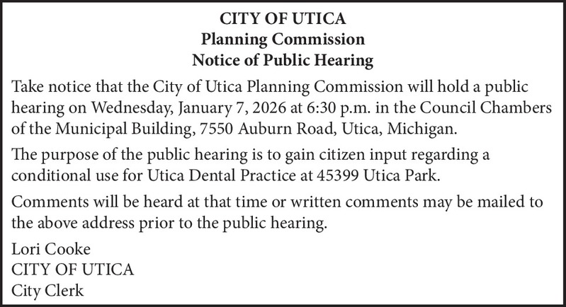 CITY OF UTICA Planning Commission Notice of Public Hearing Take notice that the City of Utica Planning Commission will hold a public hearing on Wednesday, January 7, 2026 at 6:30 p.m. in the Council Chambers of the Municipal Building, 7550 Auburn Road, Utica, Michigan. The purpose of the public hearing is to gain citizen input regarding a conditional use for Utica Dental Practice at 45399 Utica Park. Comments will be heard at that time or written comments may be mailed to the above address prior to the public hearing. Lori Cooke CITY OF UTICA City Clerk
