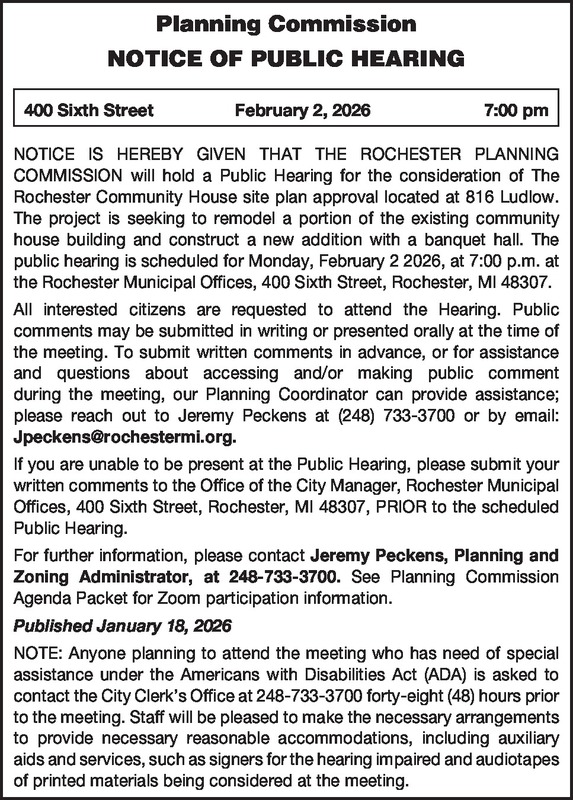 anning Commission NOTICE OF PUBLIC HEARING 400 Sixth Street February 2, 2026 7:00 pm NOTICE IS HEREBY GIVEN THAT THE ROCHESTER PLANNING COMMISSION will hold a Public Hearing for the consideration of The Rochester Community House site plan approval located at 816 Ludlow. The project is seeking to remodel a portion of the existing community house building and construct a new addition with a banquet hall. The public hearing is scheduled for Monday, February 2 2026, at 7:00 p.m. at the Rochester Municipal Offices, 400 Sixth Street, Rochester, MI 48307. All interested citizens are requested to attend the Hearing. Public comments may be submitted in writing or presented orally at the time of the meeting. To submit written comments in advance, or for assistance and questions about accessing and/or making public comment during the meeting, our Planning Coordinator can provide assistance; please reach out to Jeremy Peckens at (248) 733-3700 or by email: Jpeckens@rochestermi.org. If you are unable to be present at the Public Hearing, please submit your written comments to the Office of the City Manager, Rochester Municipal Offices, 400 Sixth Street, Rochester, MI 48307, PRIOR to the scheduled Public Hearing. For further information, please contact Jeremy Peckens, Planning and Zoning Administrator, at 248-733-3700. See Planning Commission Agenda Packet for Zoom participation information. Published January 18, 2026 NOTE: Anyone planning to attend the meeting who has need of special assistance under the Americans with Disabilities Act (ADA) is asked to contact the City Clerk’s Office at 248-733-3700 forty-eight (48) hours prior to the meeting. Staff will be pleased to make the necessary arrangements to provide necessary reasonable accommodations, including auxiliary aids and services, such as signers for the hearing impaired and audiotapes of printed materials being considered at the meeting.